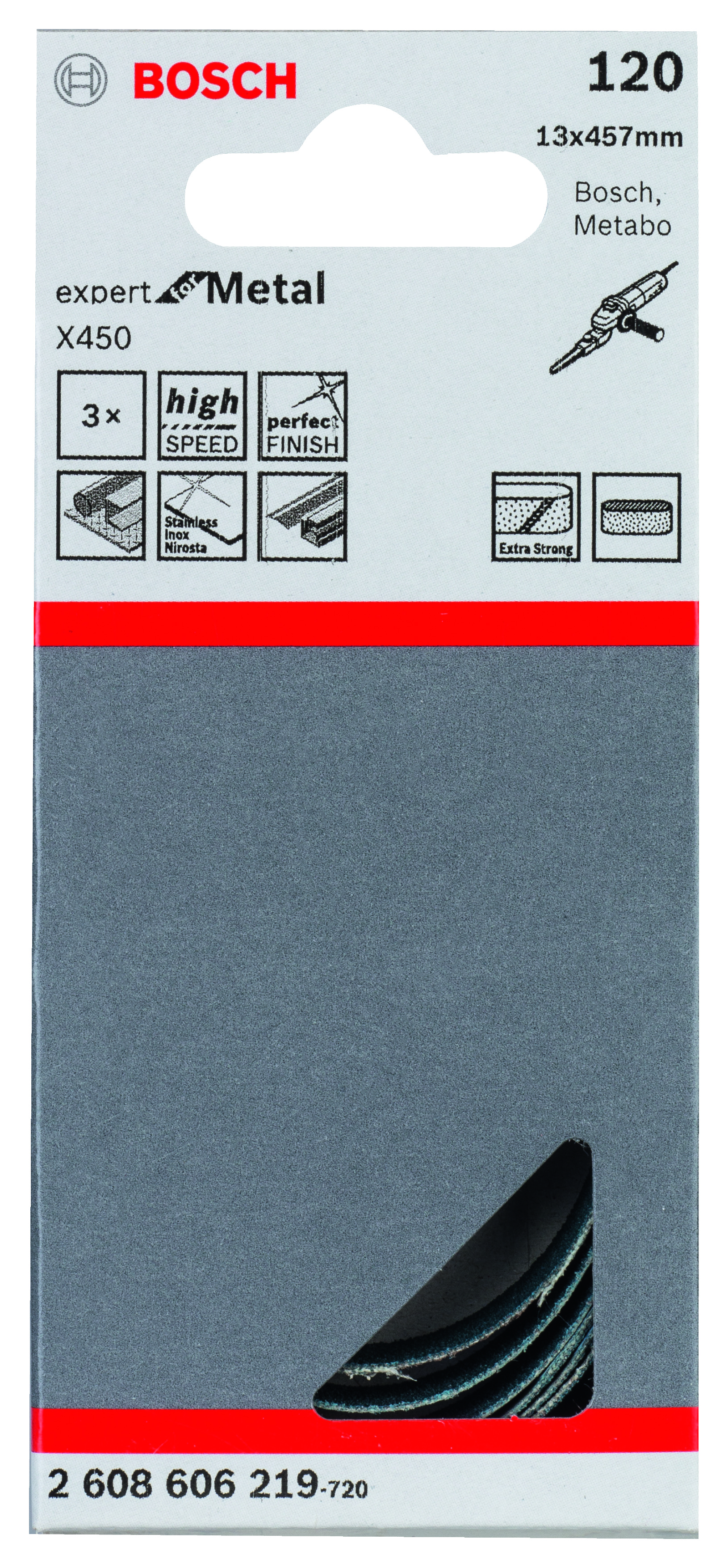 Emballage: 3Marque: BoschRéférence: 2608606219EAN: 3165140174862Description: Bande abrasive X450 Expert for Metal, 13 x 457 mm, grain 120, 3x