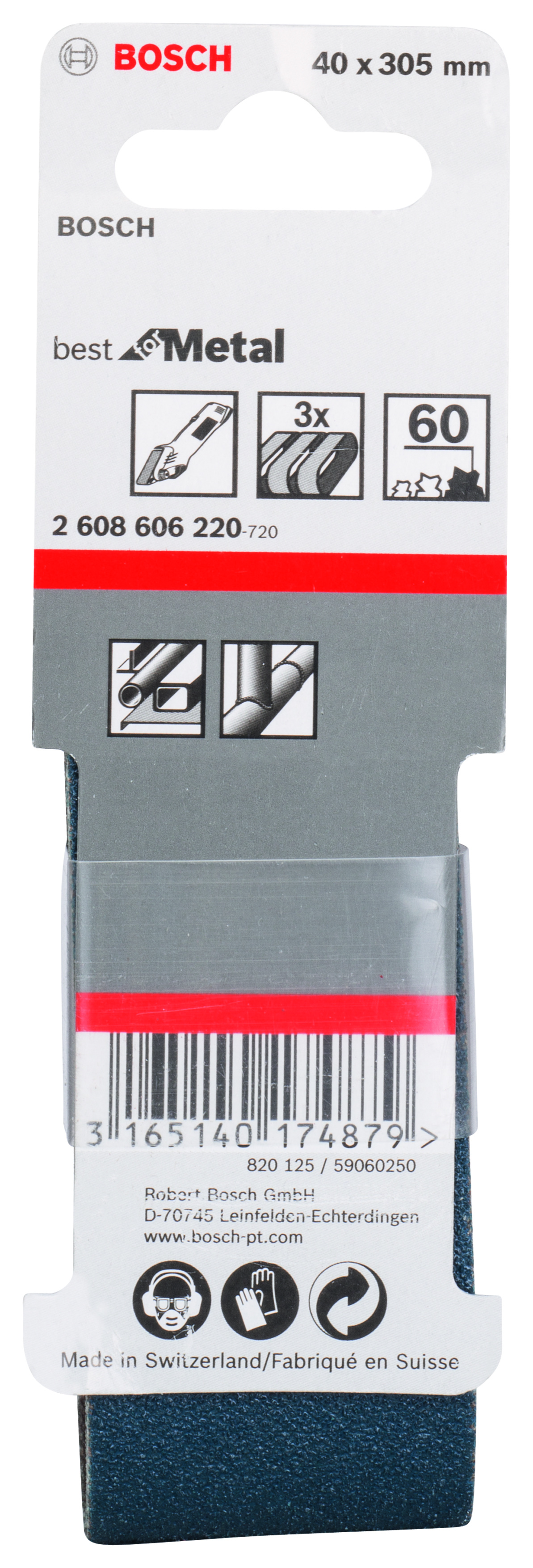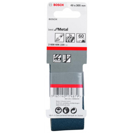 Emballage: 3Marque: BoschRéférence: 2608606220EAN: 3165140174879Description: Bande abrasive X450 Expert for Metal, 40 x 305 mm, grain 60, 3x