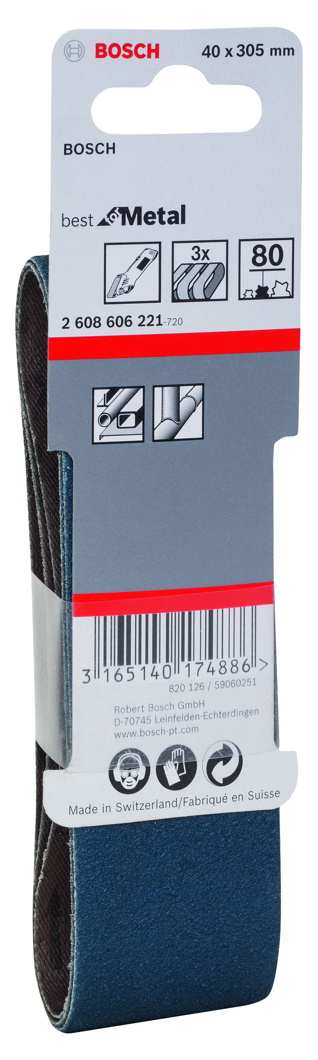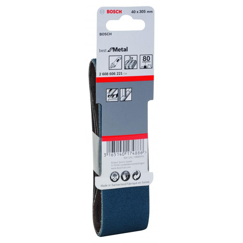 Emballage: 3Marque: BoschRéférence: 2608606221EAN: 3165140174886Description: Bande abrasive X450 Expert for Metal, 40 x 305 mm, grain 80, 3x