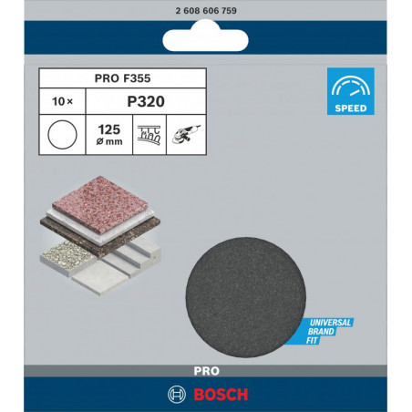 Emballage: 10Marque: BoschRéférence: 2608606759EAN: 3165140180245Description: 10 Disques de ponçage PRO F355 125 mm G320
