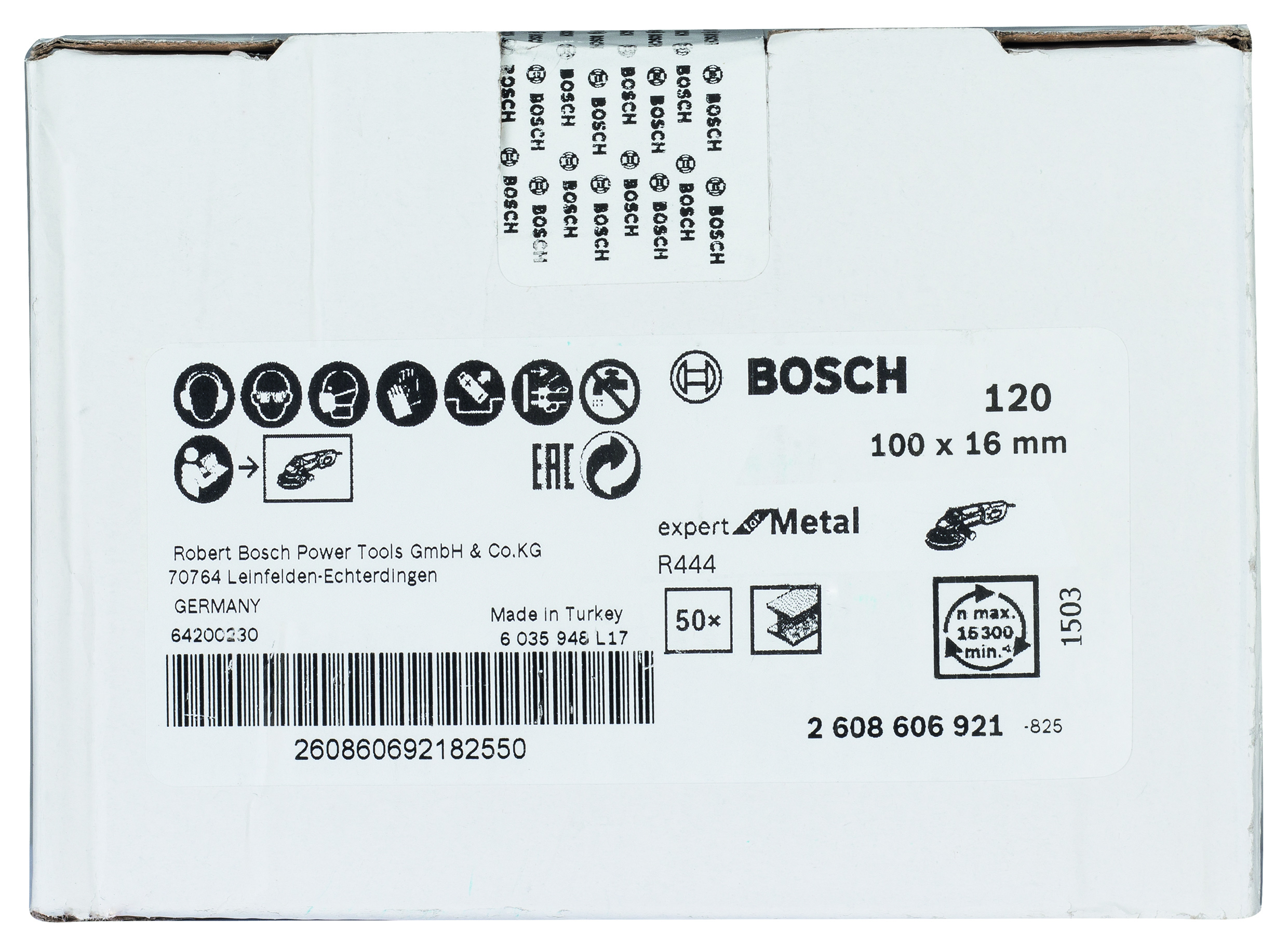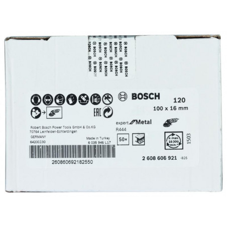 Emballage: 1Marque: BoschRéférence: 2608606921EAN: 3165140185202Description: Disque abrasif sur fibre R444 Expert for Metal, diamètre 100 mm, grain 120