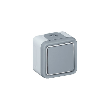 Description: Plexo poussoir simple - gris - appareil complet - 10 A - IP 55 - emballage adapté pour vente en magasin