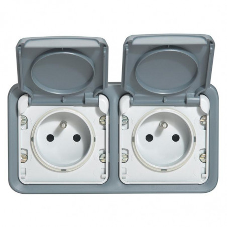 Description: Plexo prise 2 x 2P + T à volet (horizontale) - 10/16 A - 250 V - gris - appareil complet - 10 A - IP 55 - emballage adapté pour vente en magasin