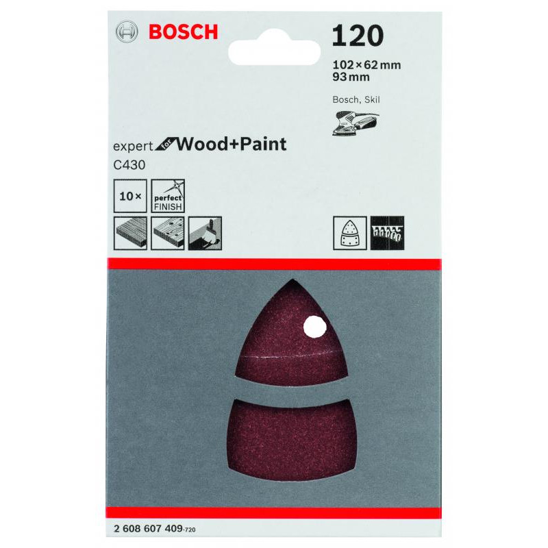 Emballage: 10Marque: BoschRéférence: 2608607409EAN: 3165140323307Description: Abrasif C430 Expert for Wood and Paint, 102 x 62, 93 mm, grain 120, 11 trous, 10x