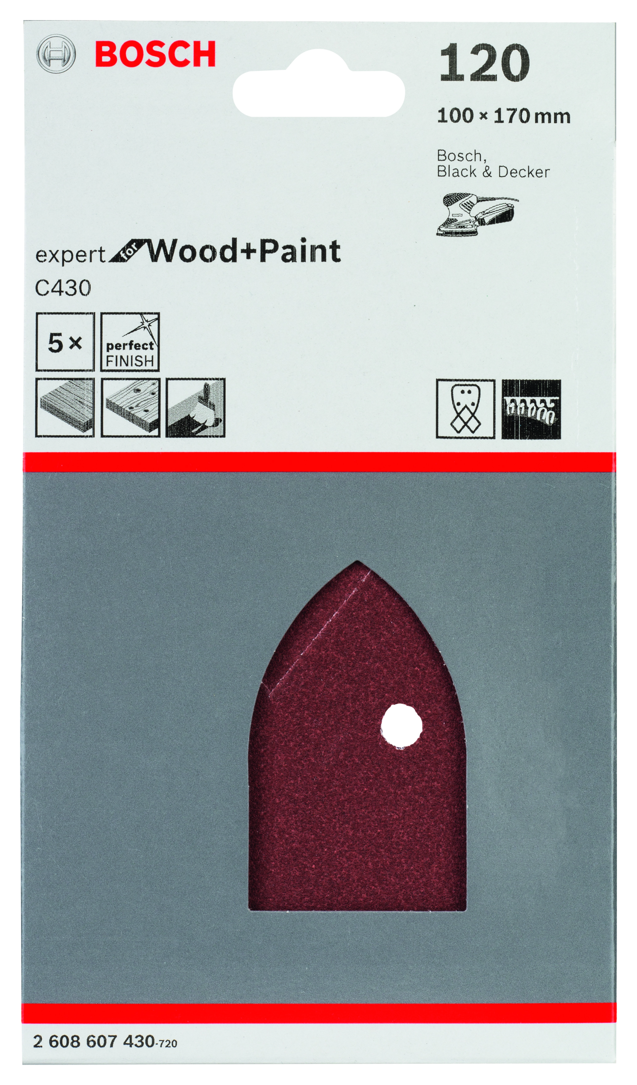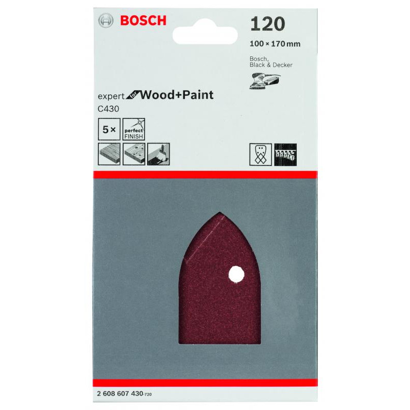 Emballage: 5Marque: BoschRéférence: 2608607430EAN: 3165140337090Description: Abrasif C430 Expert for Wood and Paint, 95 x 135 mm, grain 120, 4 trous, 5x