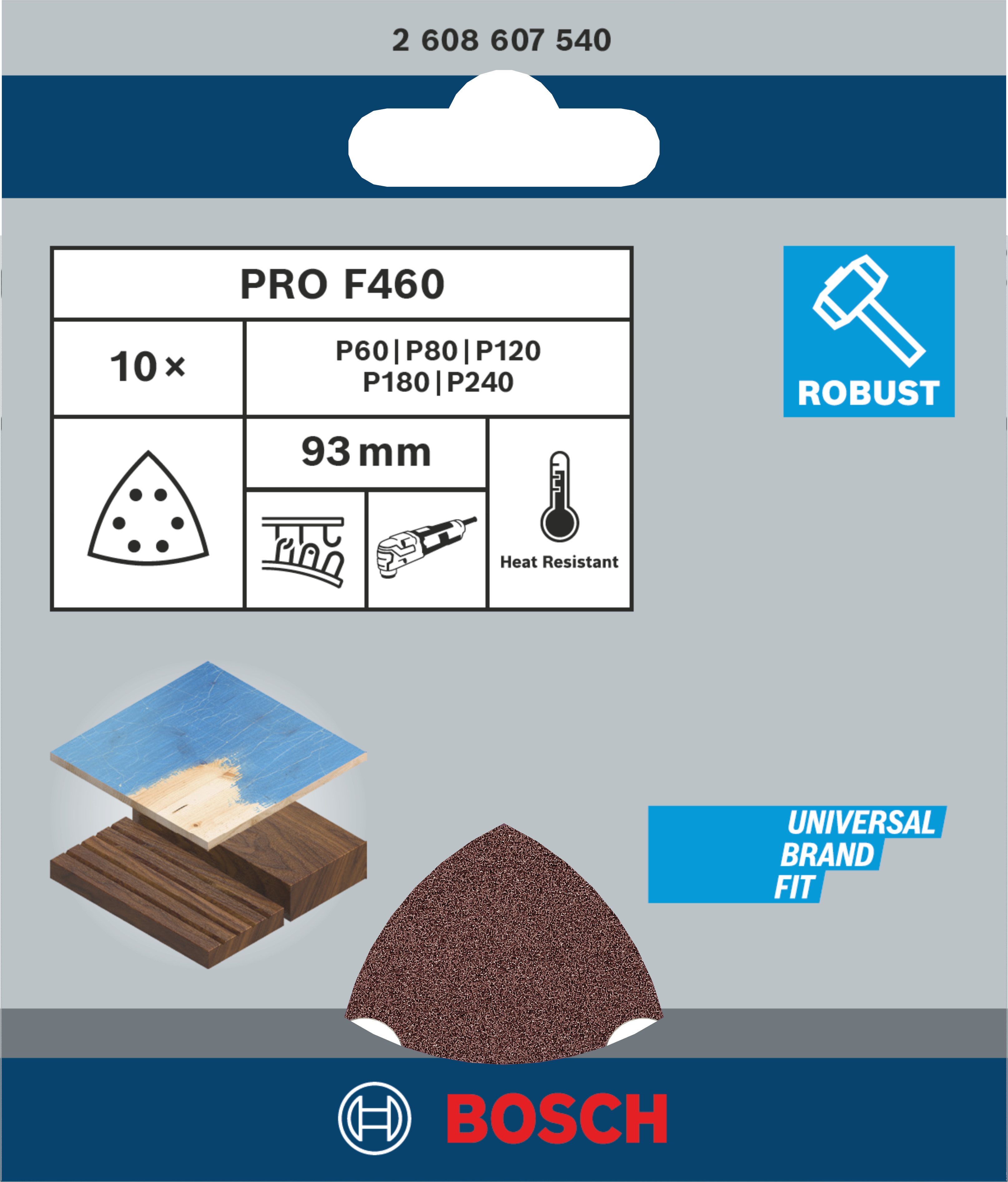 Emballage: 10Marque: BoschRéférence: 2608607540EAN: 3165140509497Description: Assortiment de 10 Feuilles de ponçage PRO F460 G40 G60 G80 G120 G180 93x93 mm