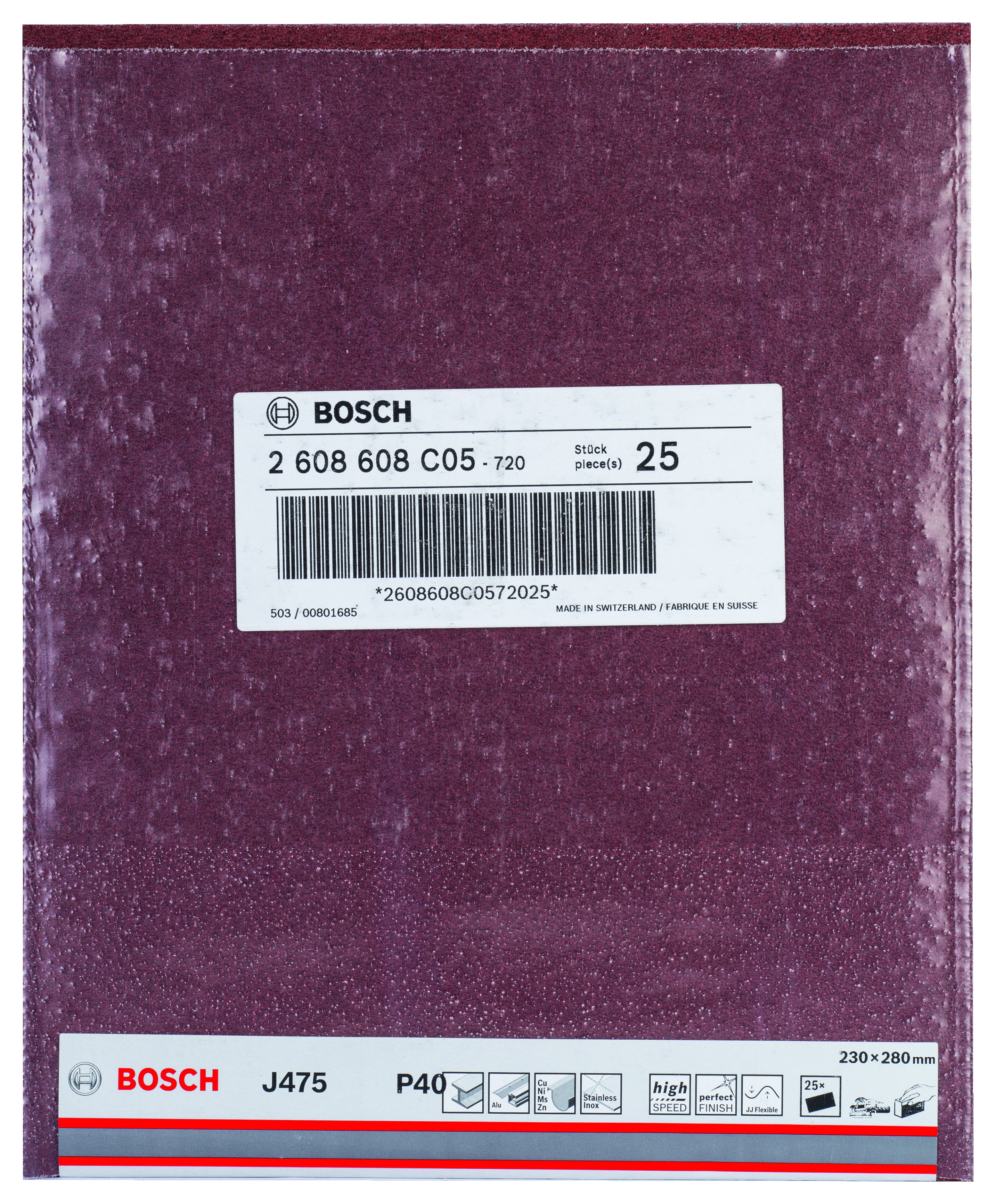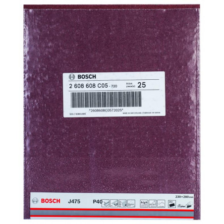 Emballage: 1Marque: BoschRéférence: 2608608C05EAN: 3165140678384Description: Abrasif J475 Best for Metal, 230 x 280 mm, grain 40