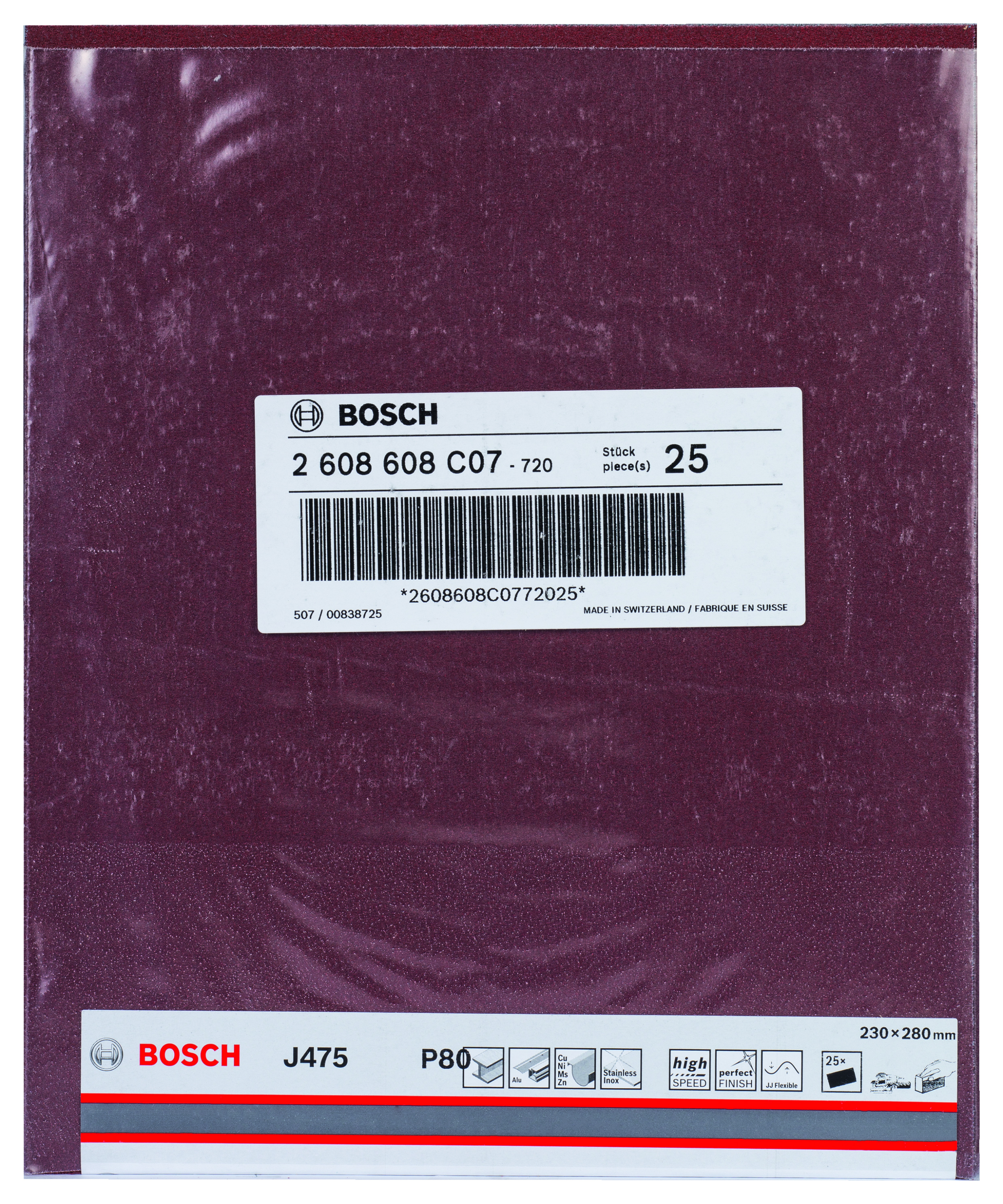 Emballage: 1Marque: BoschRéférence: 2608608C07EAN: 3165140678407Description: Abrasif J475 Best for Metal, 230 x 280 mm, grain 80