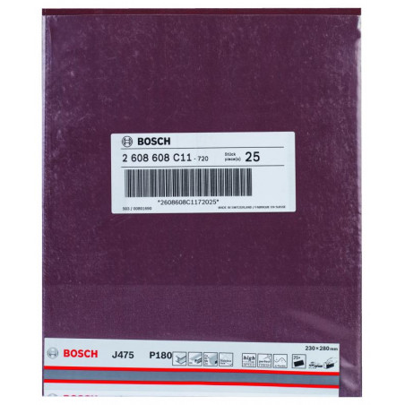 Emballage: 1Marque: BoschRéférence: 2608608C11EAN: 3165140678445Description: Abrasif J475 Best for Metal, 230 x 280 mm, grain 180
