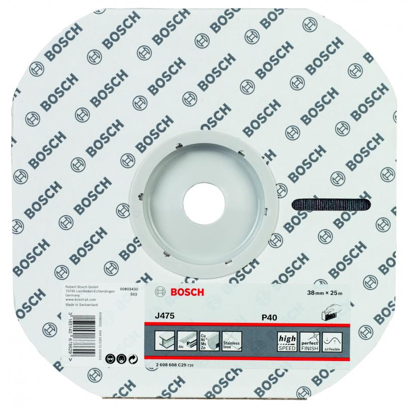 Emballage: 1Marque: BoschRéférence: 2608608C29EAN: 3165140678629Description: Rouleau abrasif J475 Best for Metal, 38 mm x 25 m, grain 40