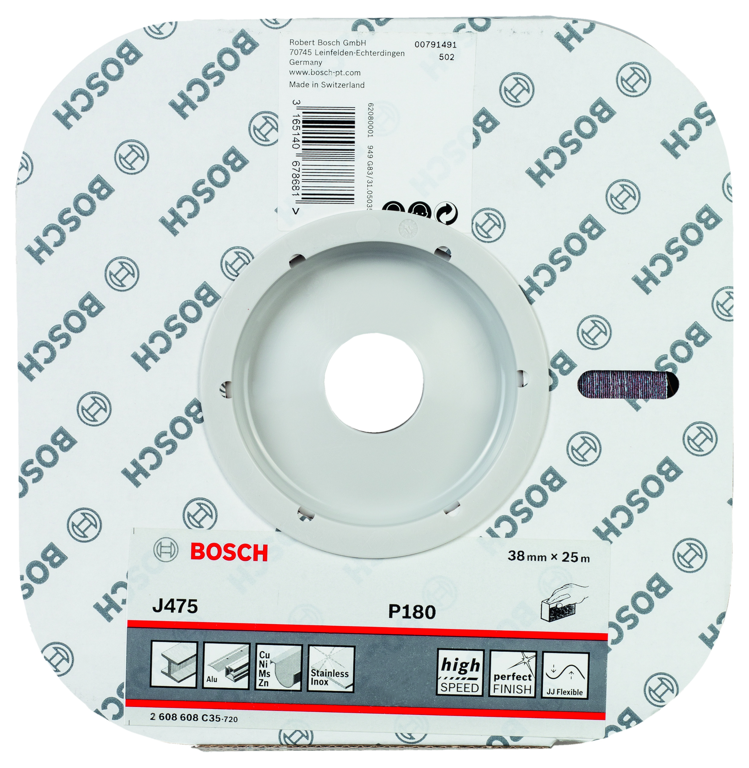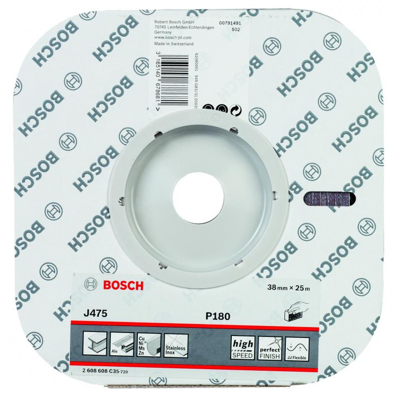 Emballage: 1Marque: BoschRéférence: 2608608C35EAN: 3165140678681Description: Rouleau abrasif J475 Best for Metal, 38 mm x 25 m, grain 180
