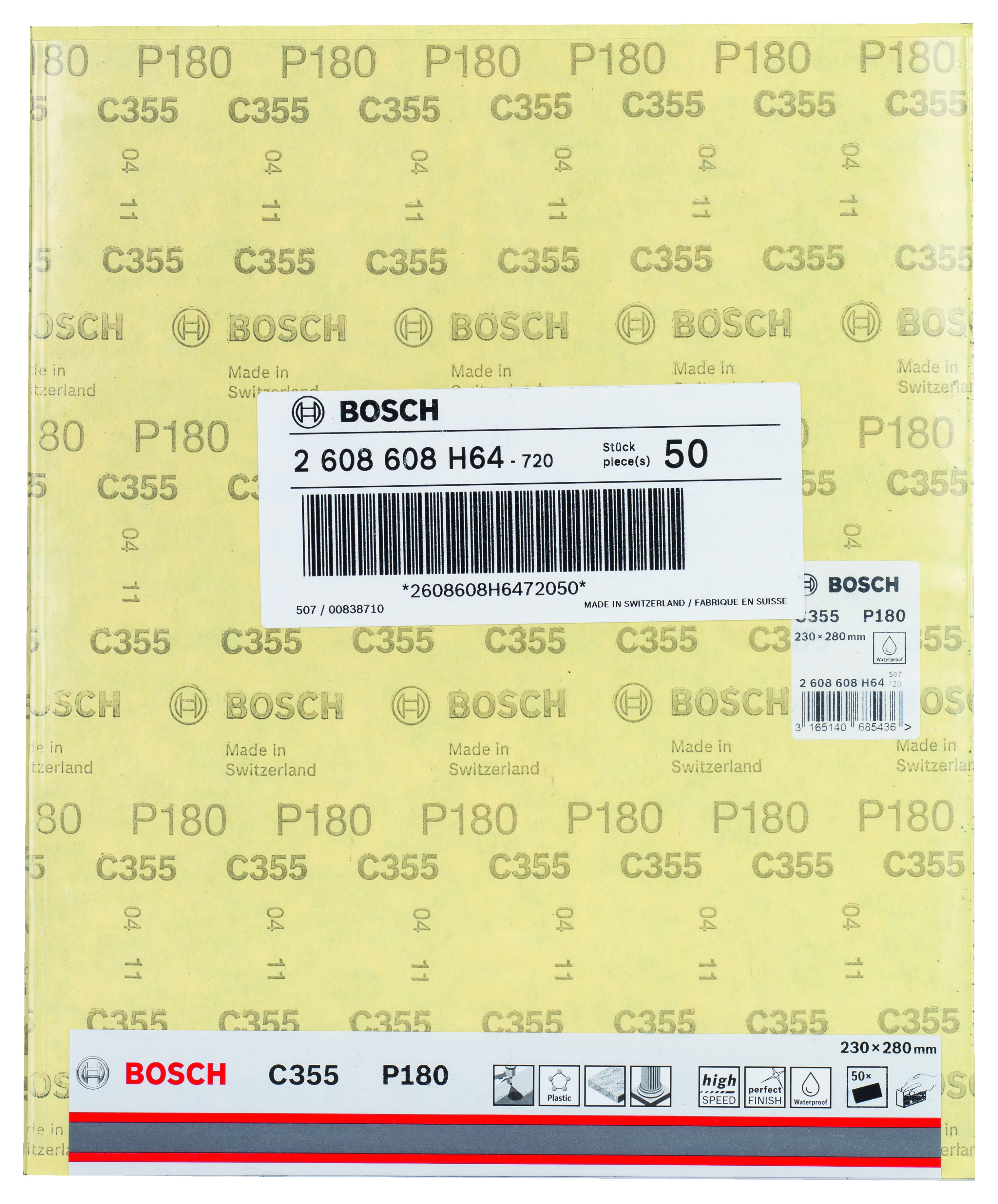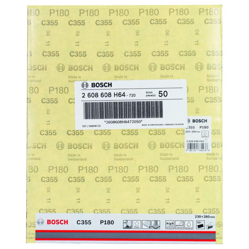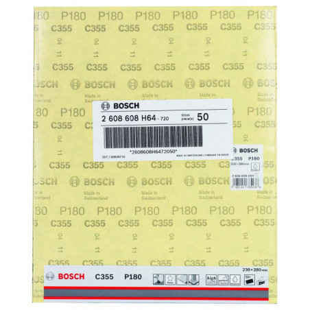 Emballage: 1 Marque: Bosch Référence: 2608608H64 EAN: 3165140685436 Description: Abrasif C355 Best for Coatings and Composites, 230 x 280 mm, grain 180