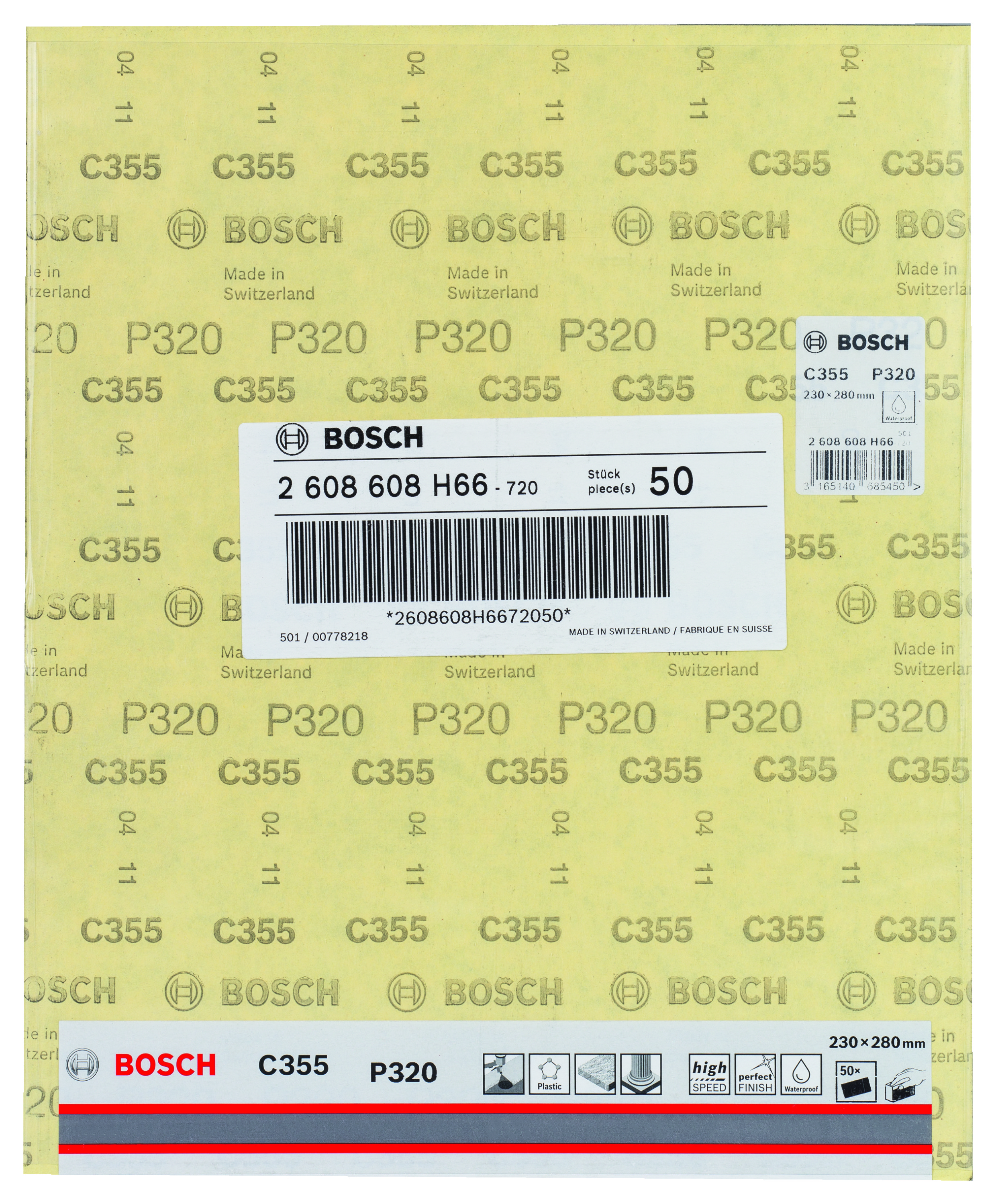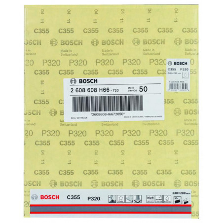 Emballage: 1 Marque: Bosch Référence: 2608608H66 EAN: 3165140685450 Description: Abrasif C355 Best for Coatings and Composites, 230 x 280 mm, grain 320