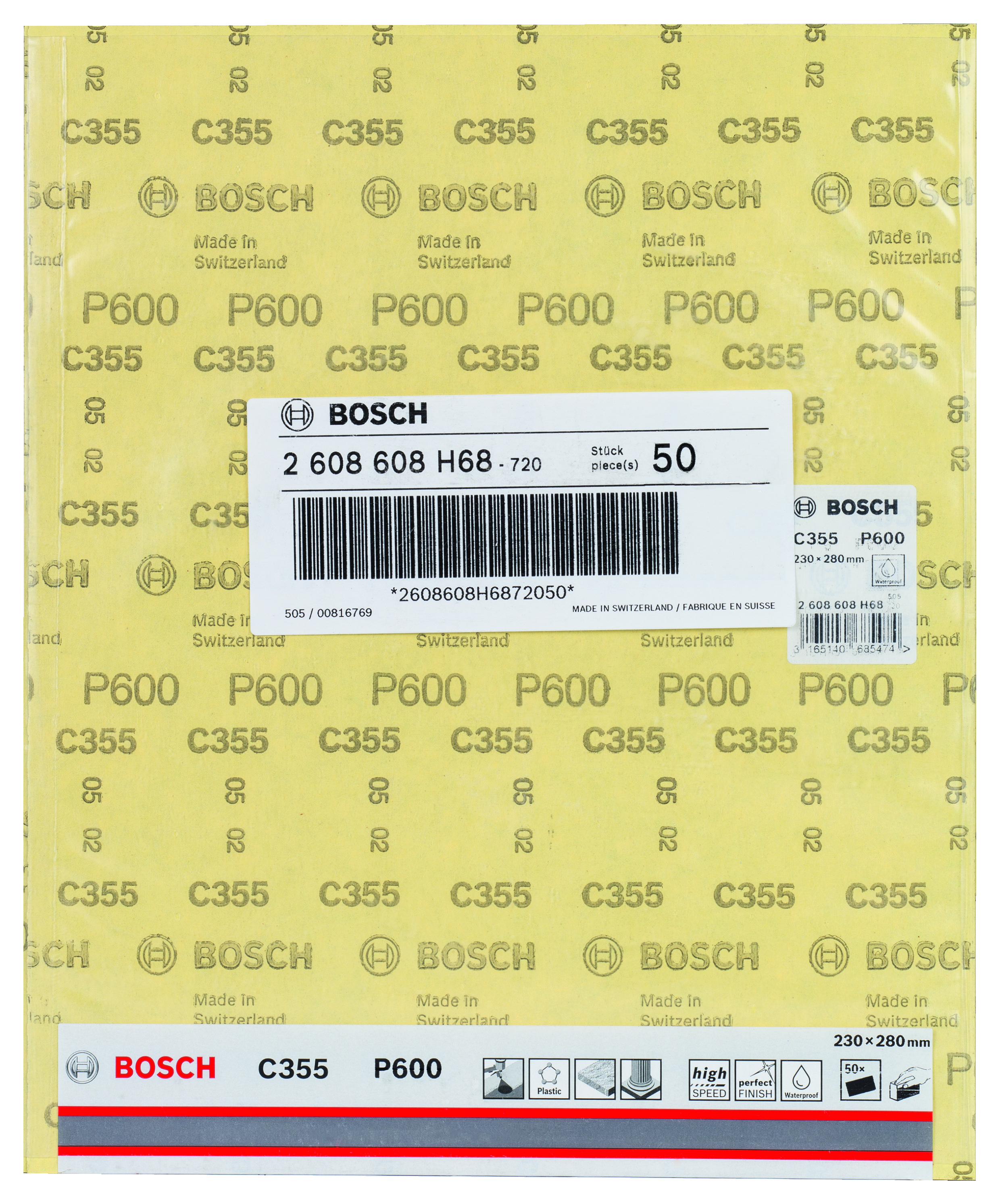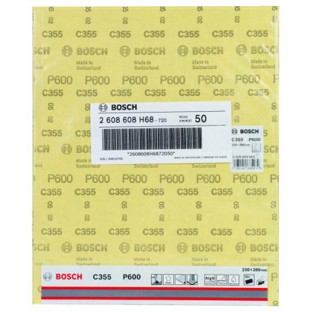 Emballage: 1 Marque: Bosch Référence: 2608608H68 EAN: 3165140685474 Description: Abrasif C355 Best for Coatings and Composites, 230 x 280 mm, grain 600