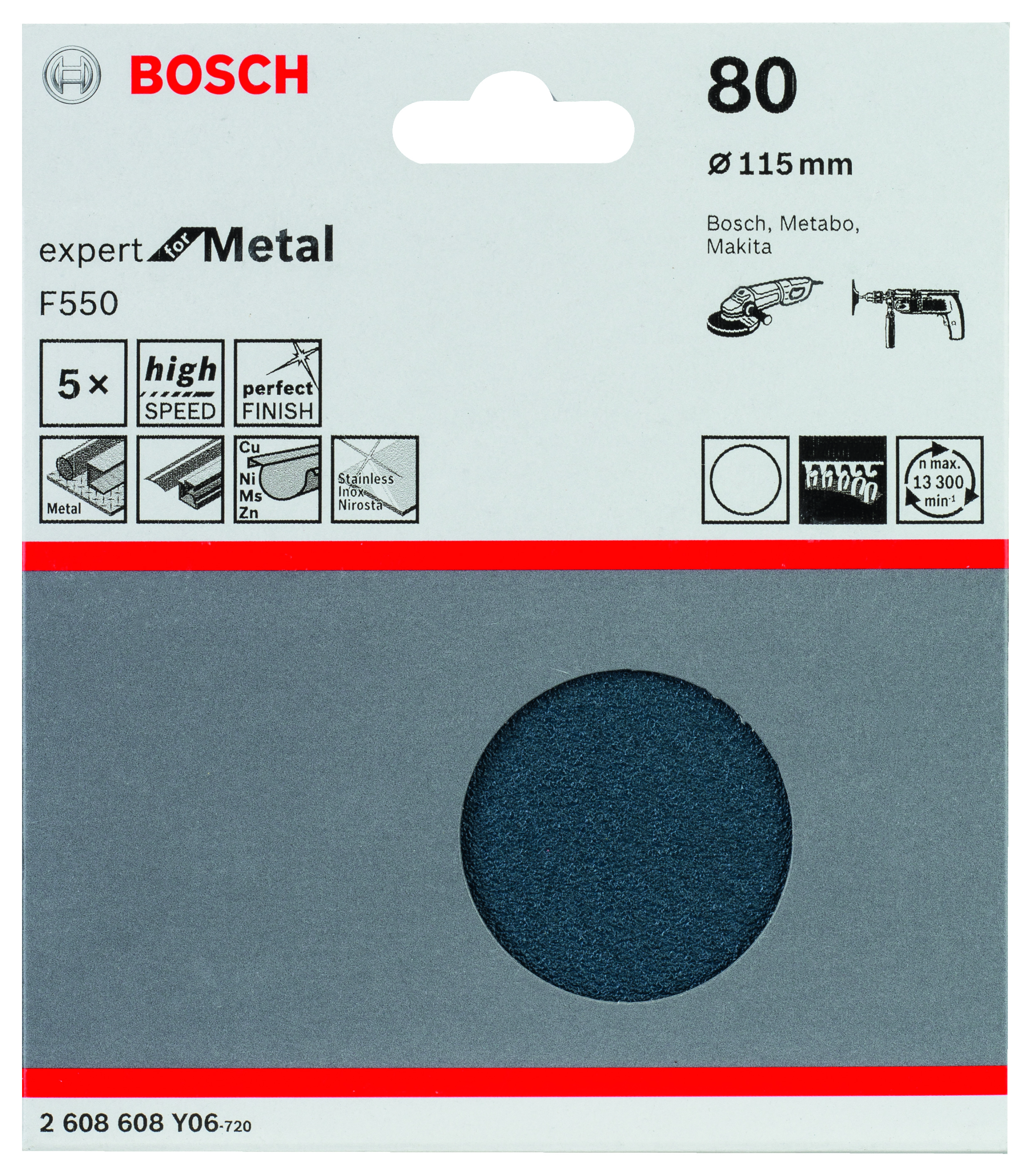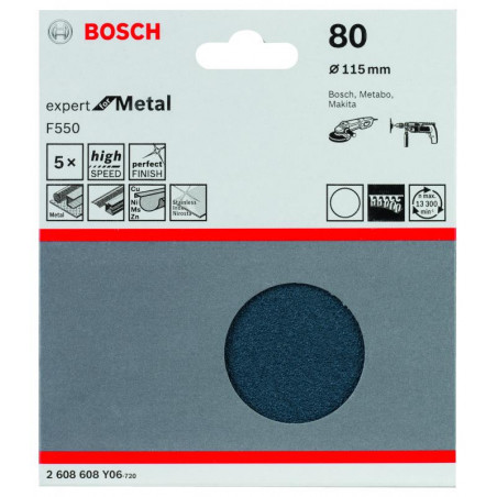 Emballage: 5Marque: BoschRéférence: 2608608Y06EAN: 3165140805896Description: Abrasif pour meuleuse F550 Expert for Metal, diamètre 115 mm, grain 80, 5x
