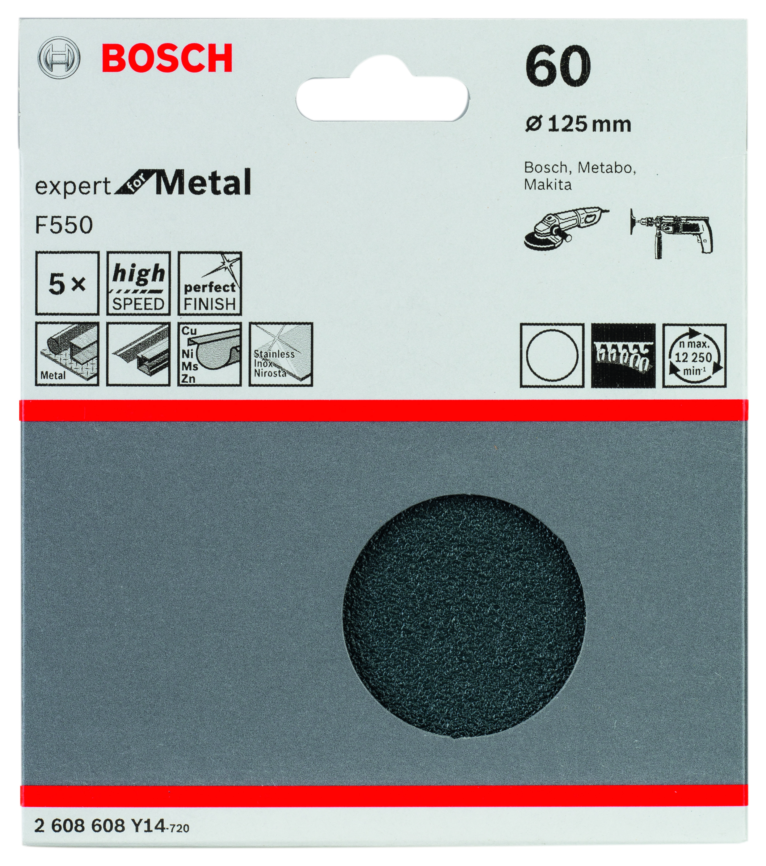 Emballage: 5Marque: BoschRéférence: 2608608Y14EAN: 3165140805971Description: Abrasif pour meuleuse F550 Expert for Metal, diamètre 125 mm, grain 60, 5x