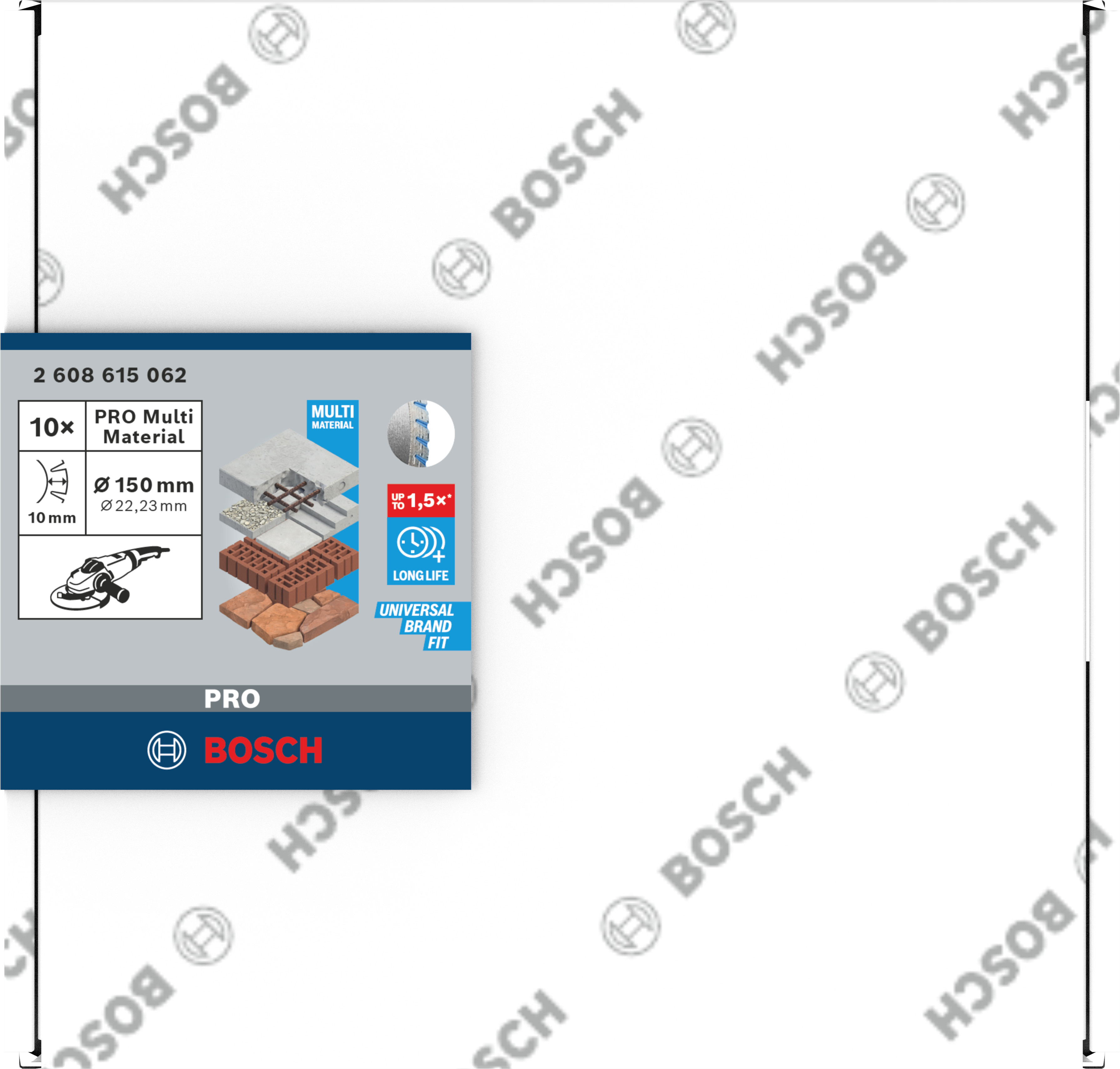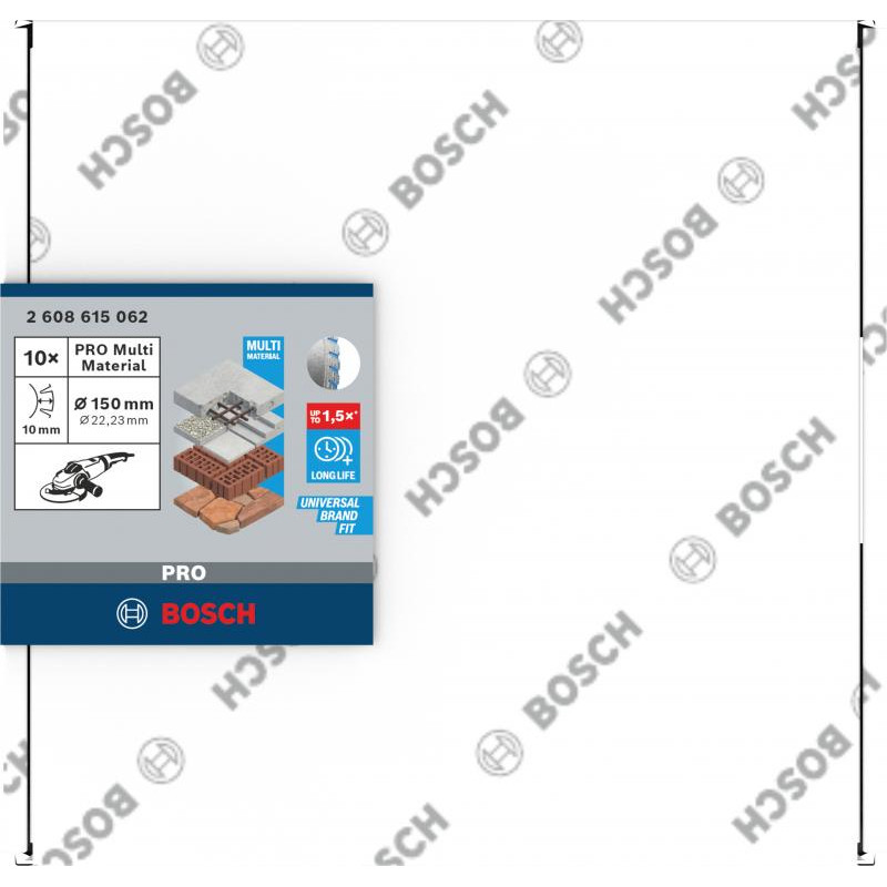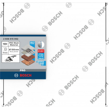 Emballage: 10Marque: BoschRéférence: 2608615062EAN: 3165140869720Description: 10 disques diamant PRO Multi Material 150x22,23 mm