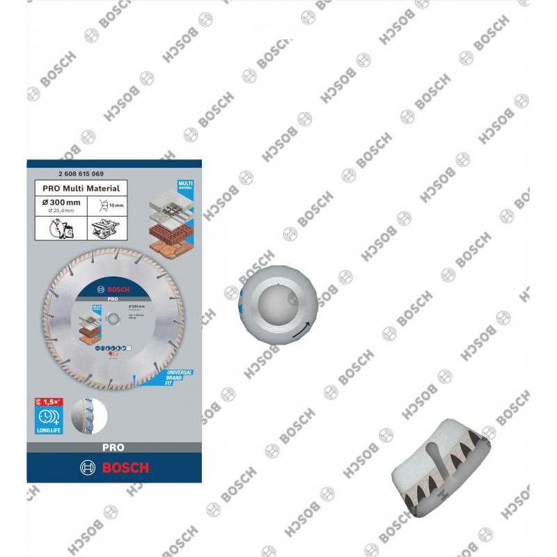 Emballage: 1Marque: BoschRéférence: 2608615069EAN: 3165140869799Description: Disque diamant PRO Multi Material 300x25,4 mm