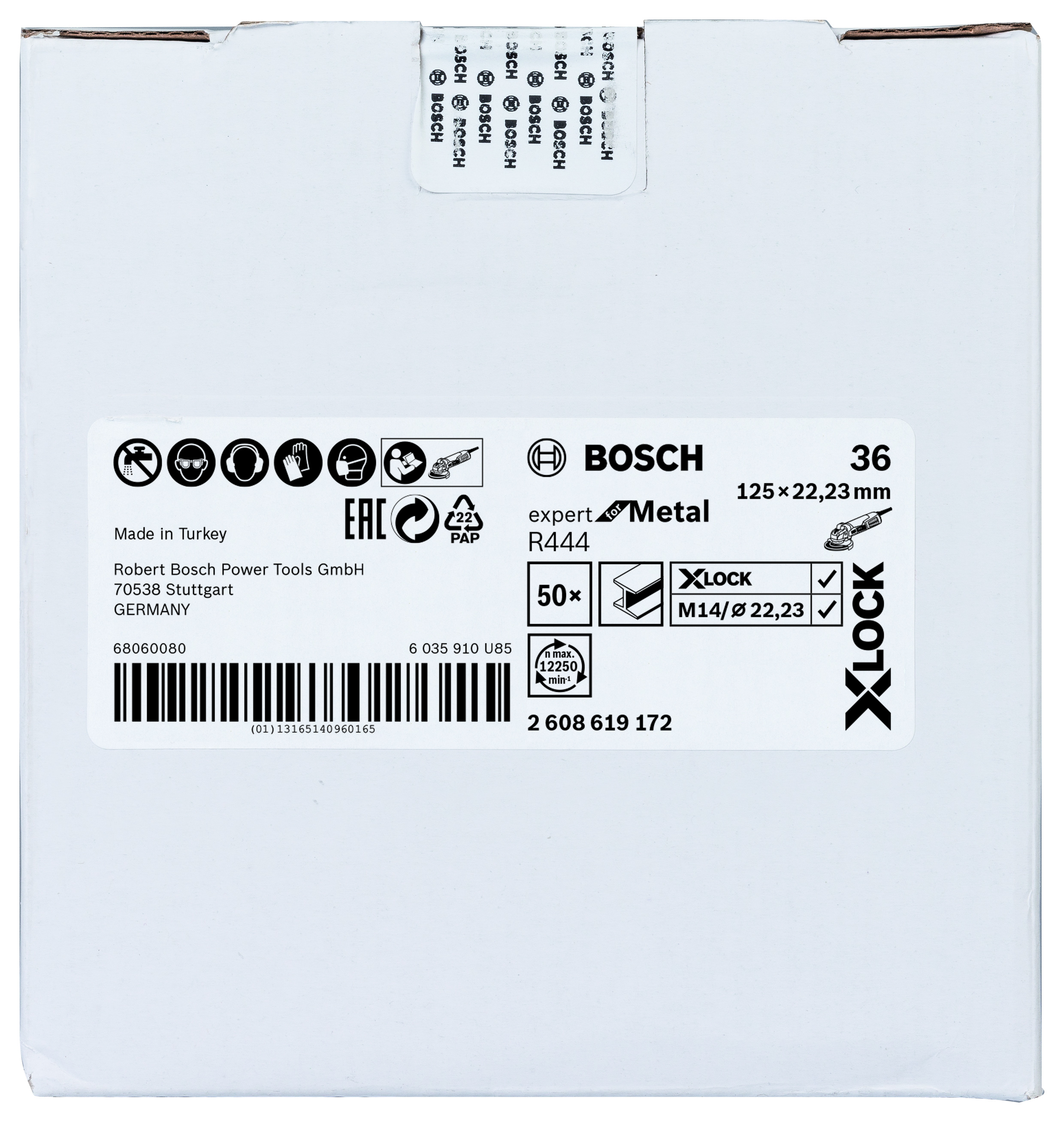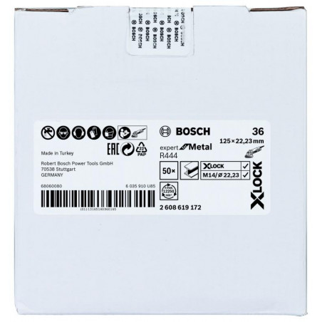 Emballage: 1Marque: BoschRéférence: 2608619172EAN: 3165140960168Description: X-LOCK disque à fibre, 125mm, G 36, R444, Expert for Metal
