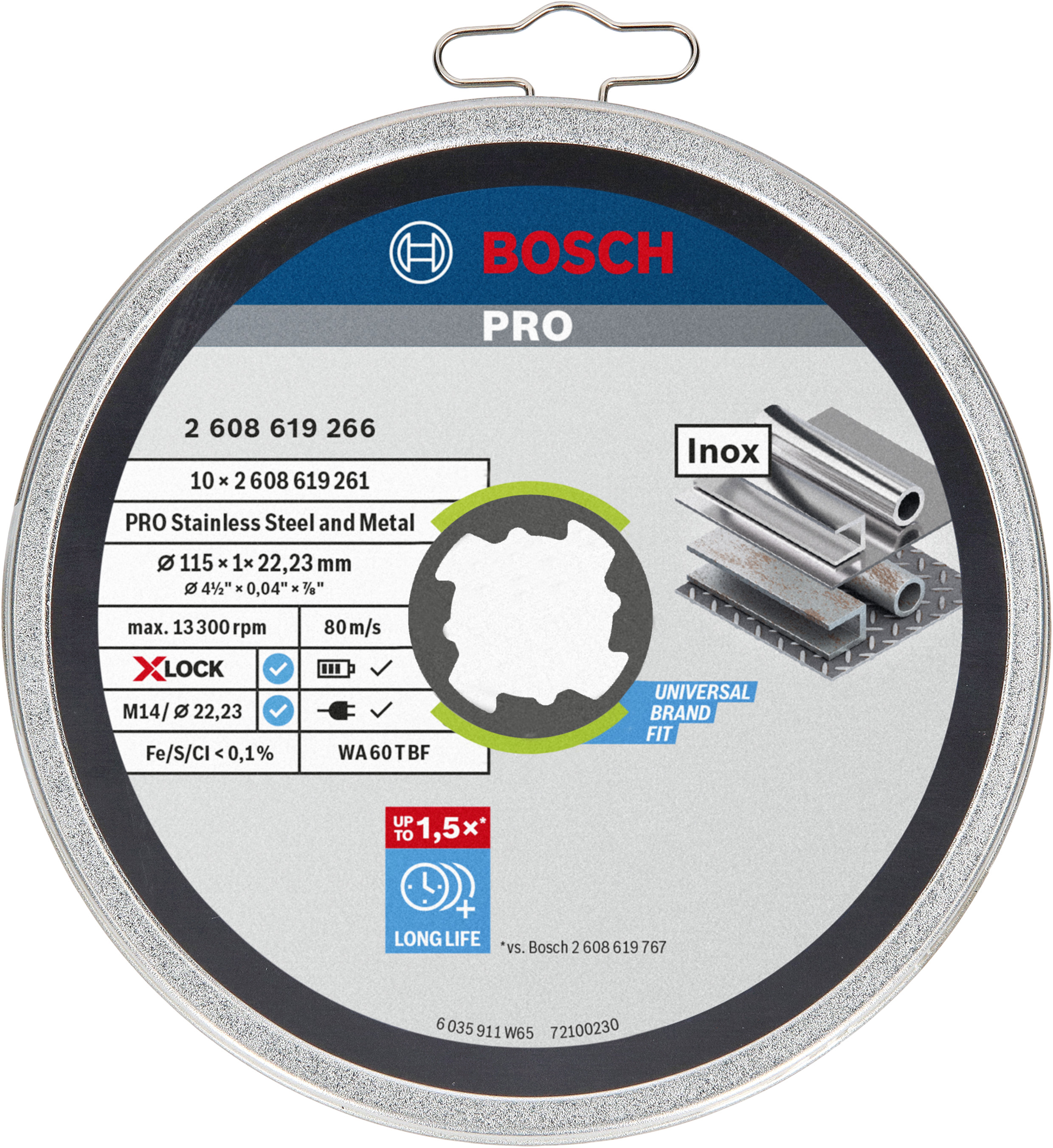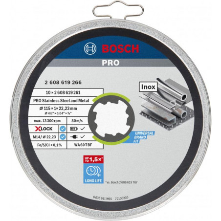 Emballage: 10 Marque: Bosch Référence: 2608619266 EAN: 3165140947565 Description: 10 Disques à tronçonner PRO X-LOCK pour le Métal et l'Inox 115x1x22.23 mm Plat