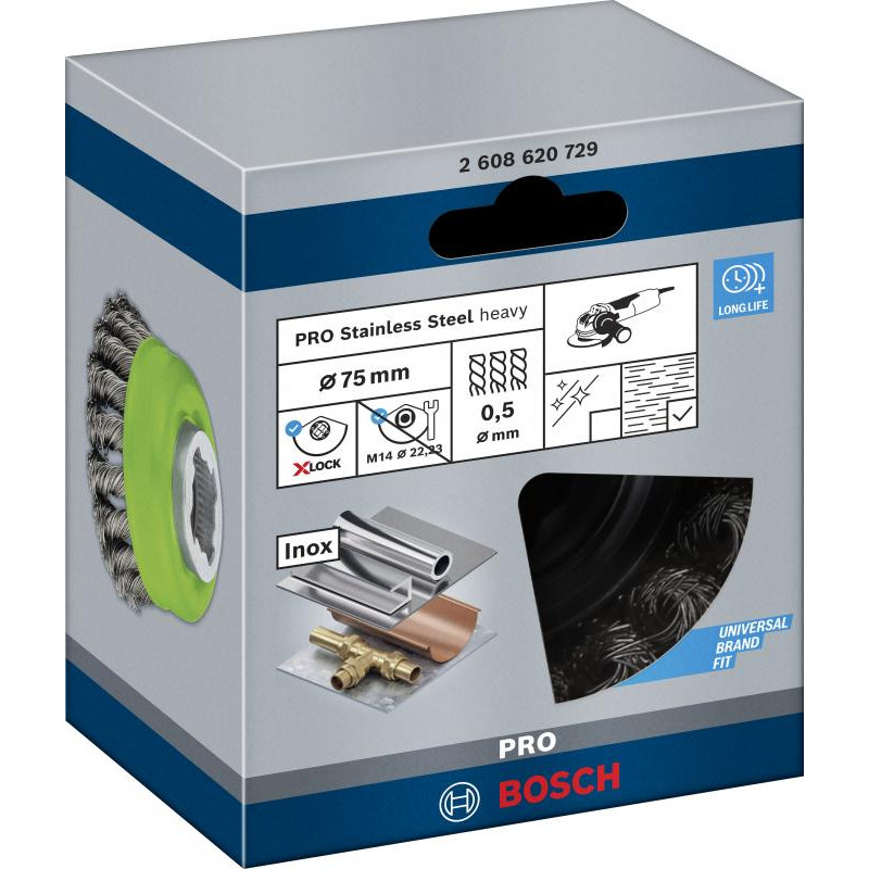 Emballage: 1Marque: BoschRéférence: 2608620729EAN: 3165140954150Description: Brosse boisseau PRO X-Lock pour l'Inox fils torsadés 75x0.5