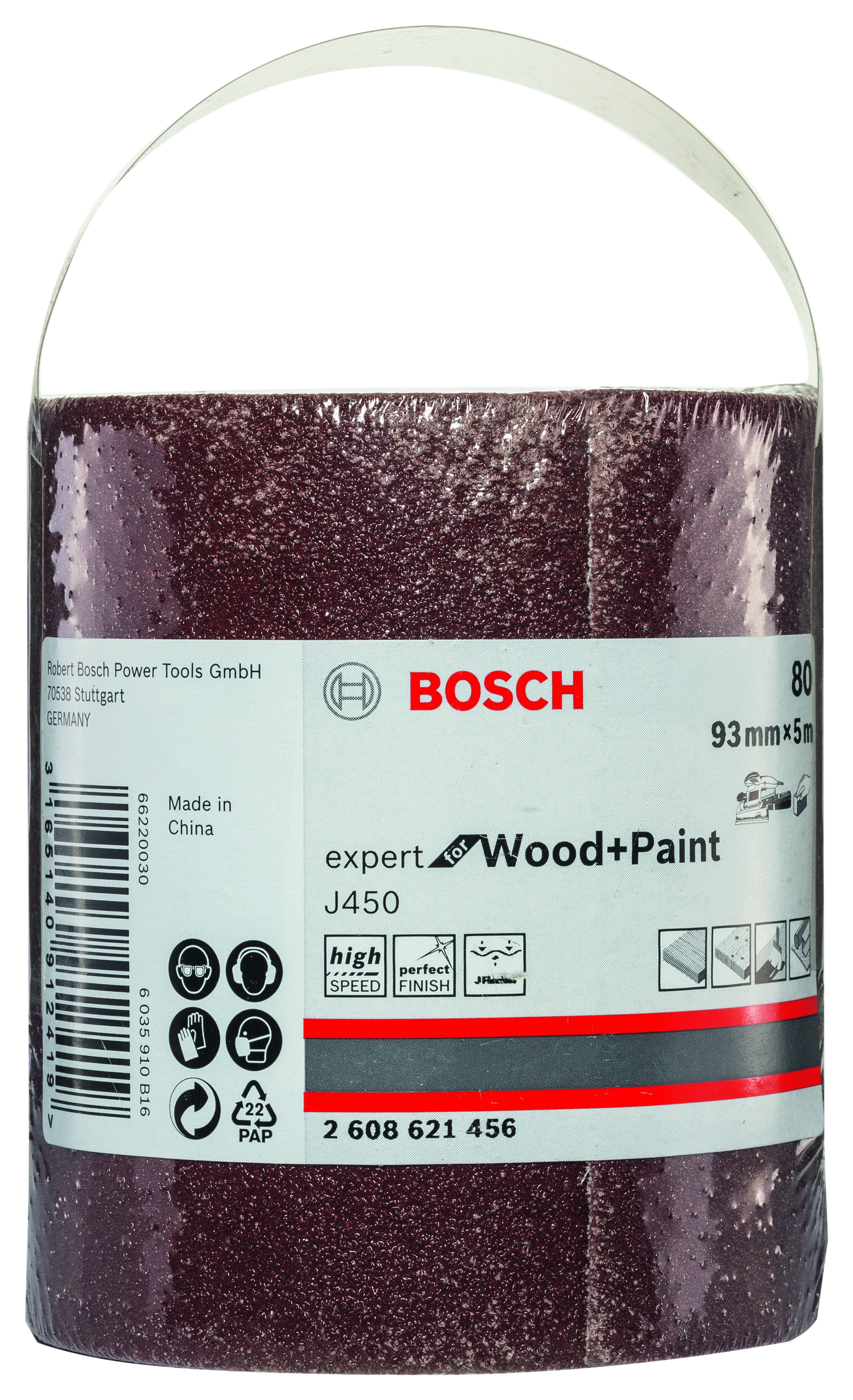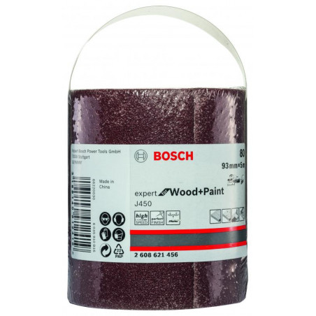 Emballage: 1Marque: BoschRéférence: 2608621456EAN: 3165140912419Description: Rouleau abrasif J450 Expert for Wood and Paint, 93 mm x 5 m, grain 80