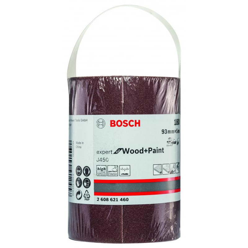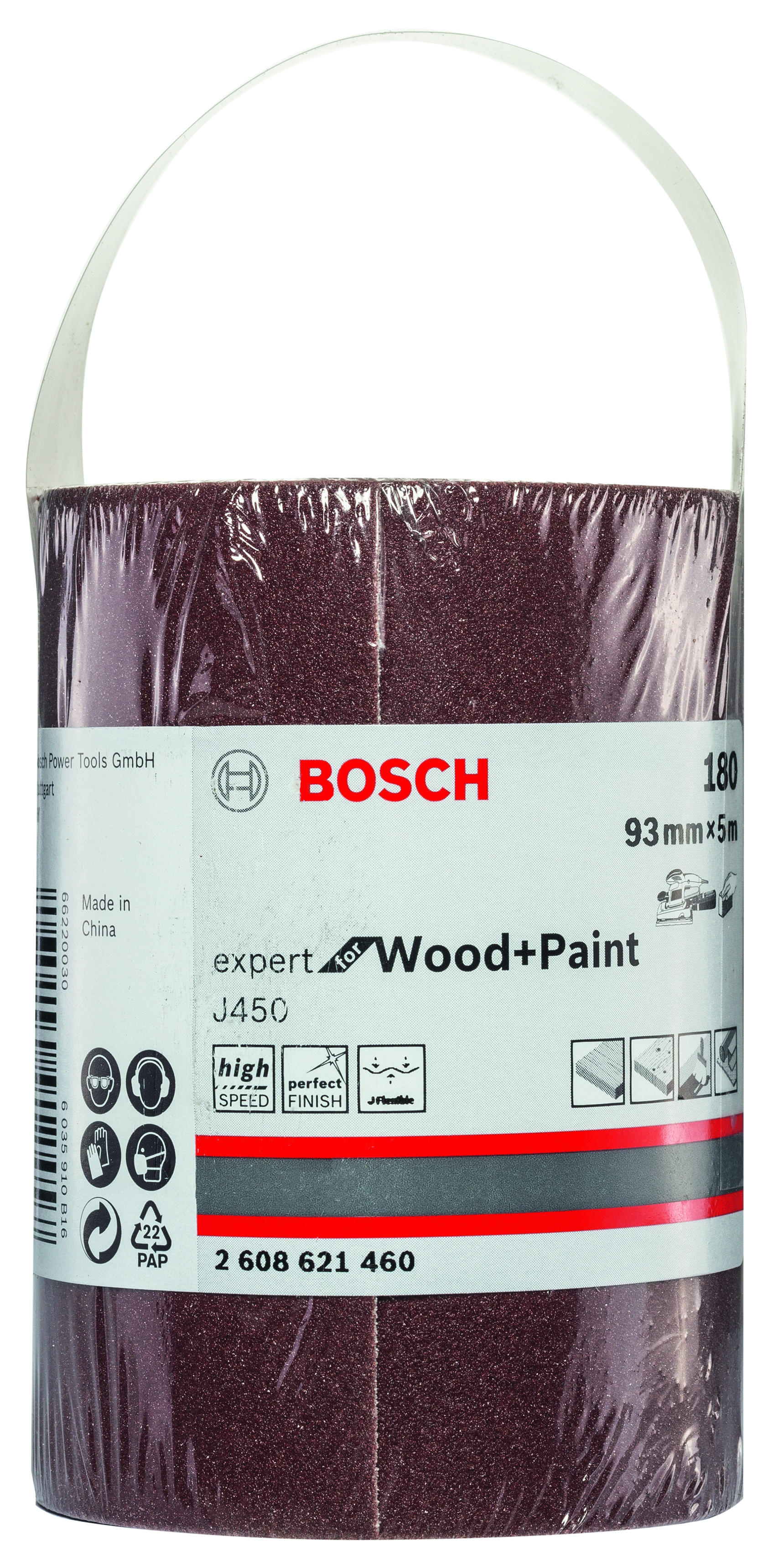 Emballage: 1 Marque: Bosch Référence: 2608621460 EAN: 3165140912457 Description: Rouleau abrasif J450 Expert for Wood and Paint, 93 mm x 5 m, grain 180