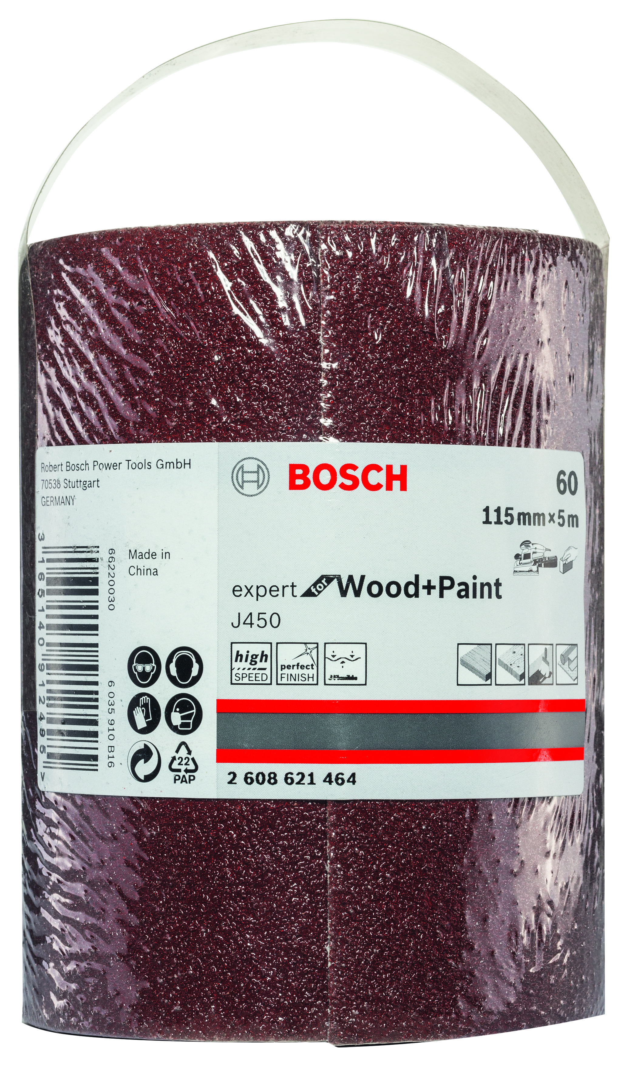 Emballage: 1 Marque: Bosch Référence: 2608621464 EAN: 3165140912495 Description: Rouleau abrasif J450 Expert for Wood and Paint, 115 mm x 5 m, grain 60