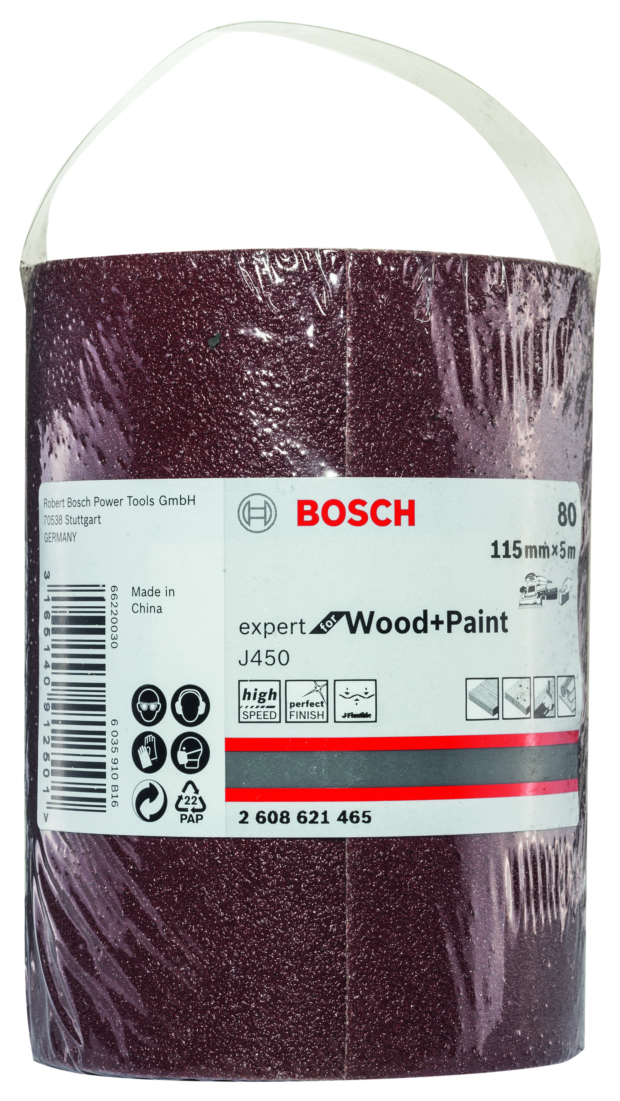 Emballage: 1 Marque: Bosch Référence: 2608621465 EAN: 3165140912501 Description: Rouleau abrasif J450 Expert for Wood and Paint, 115 mm x 5 m, grain 80