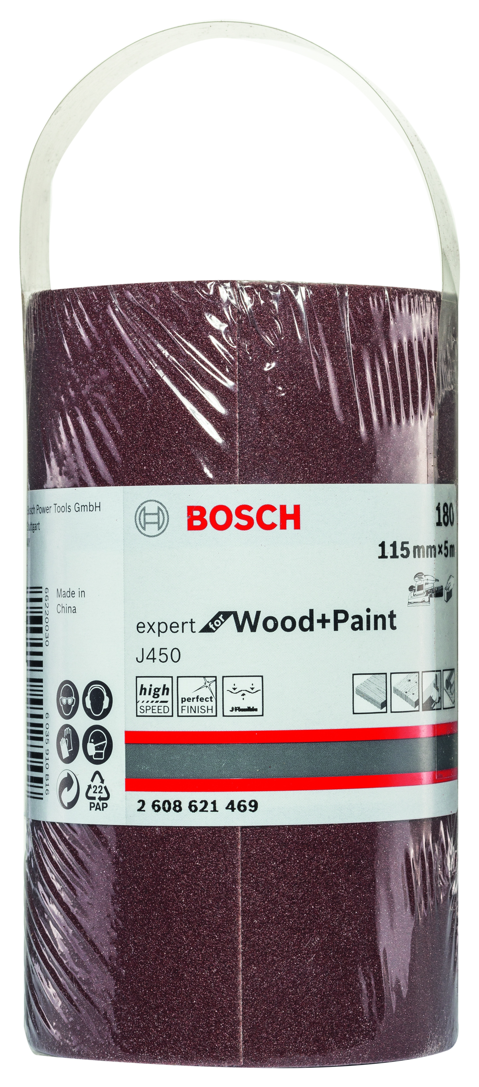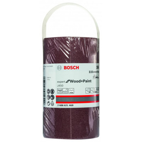 Emballage: 1 Marque: Bosch Référence: 2608621469 EAN: 3165140912549 Description: Rouleau abrasif J450 Expert for Wood and Paint, 115 mm x 5 m, grain 180