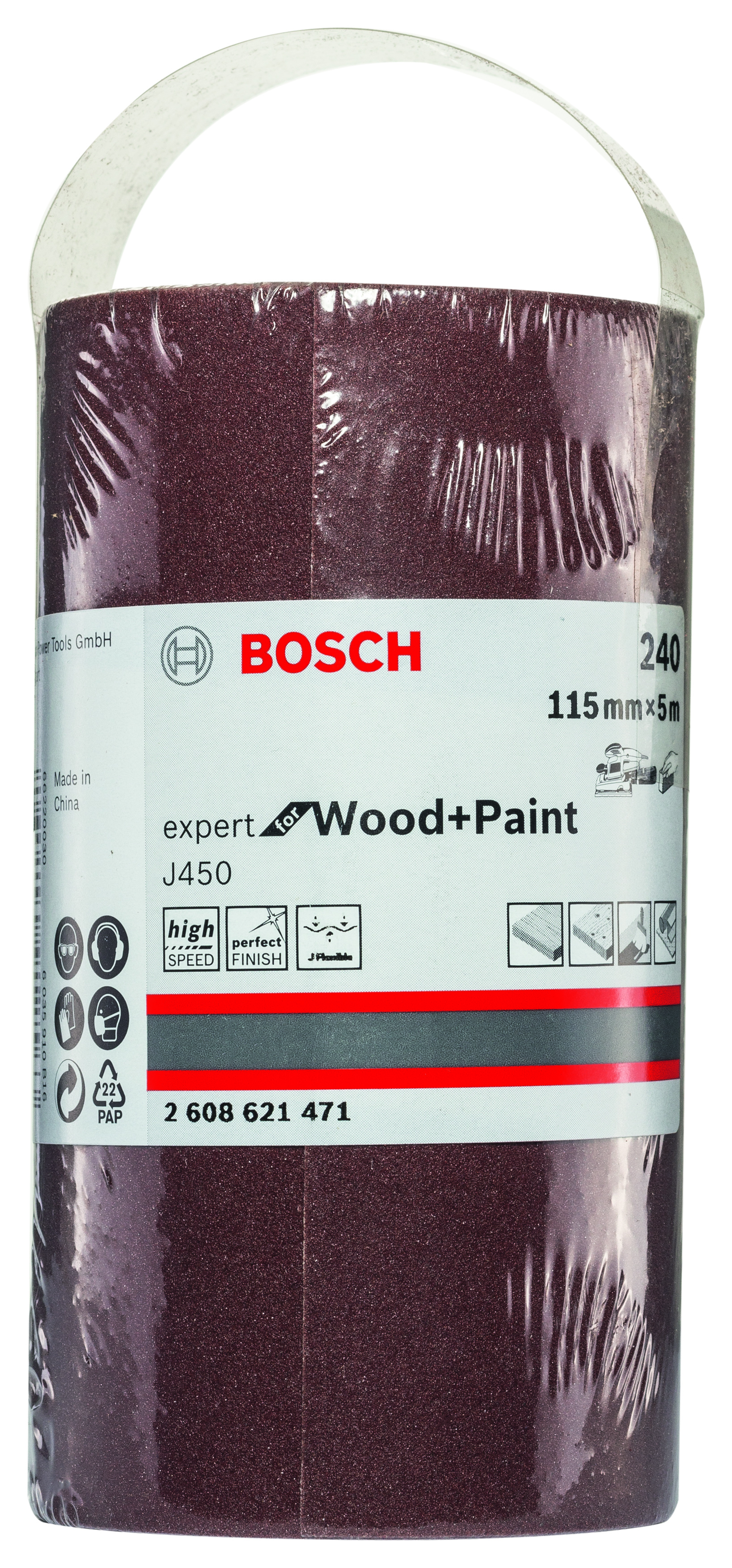 Emballage: 1 Marque: Bosch Référence: 2608621471 EAN: 3165140912563 Description: Rouleau abrasif J450 Expert for Wood and Paint, 115 mm x 5 m, grain 240