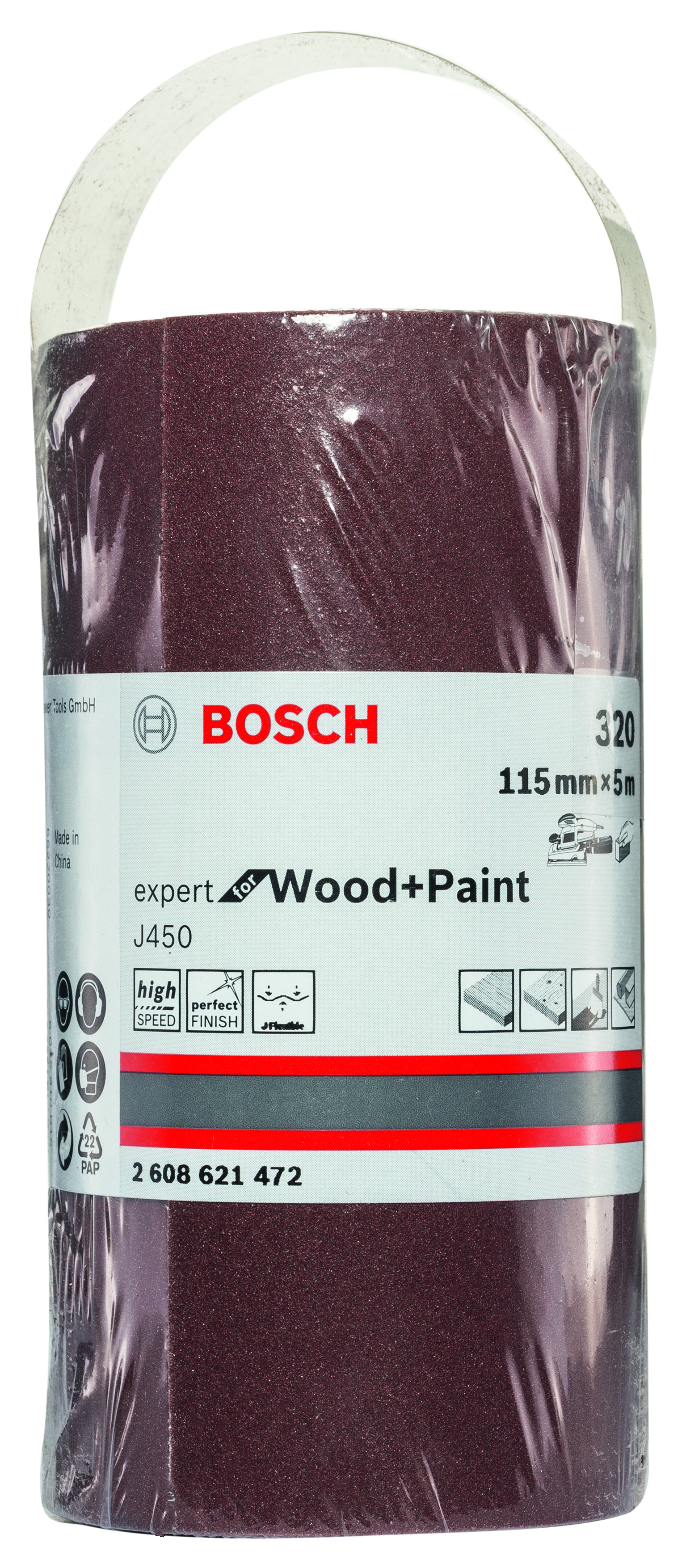Emballage: 1 Marque: Bosch Référence: 2608621472 EAN: 3165140912570 Description: Rouleau abrasif J450 Expert for Wood and Paint, 115 mm x 5 m, grain 320