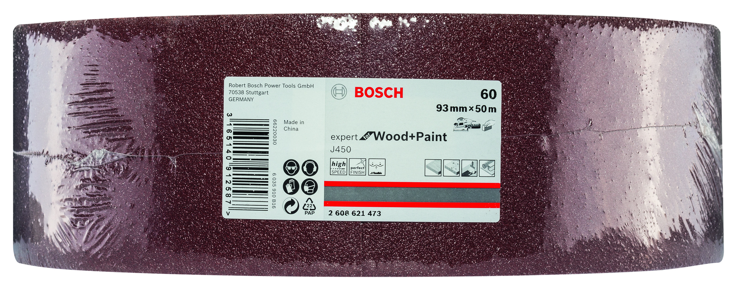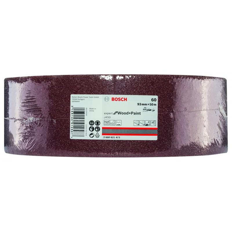 Emballage: 1 Marque: Bosch Référence: 2608621473 EAN: 3165140912587 Description: Rouleau abrasif J450 Expert for Wood and Paint, 93 mm x 50 m, grain 60