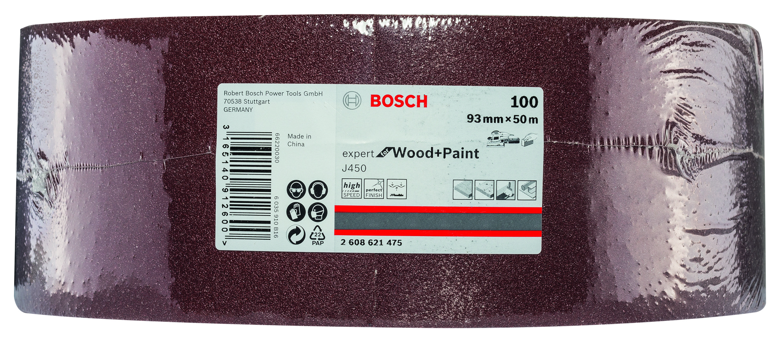 Emballage: 1 Marque: Bosch Référence: 2608621475 EAN: 3165140912600 Description: Rouleau abrasif J450 Expert for Wood and Paint, 93 mm x 50 m, grain 100