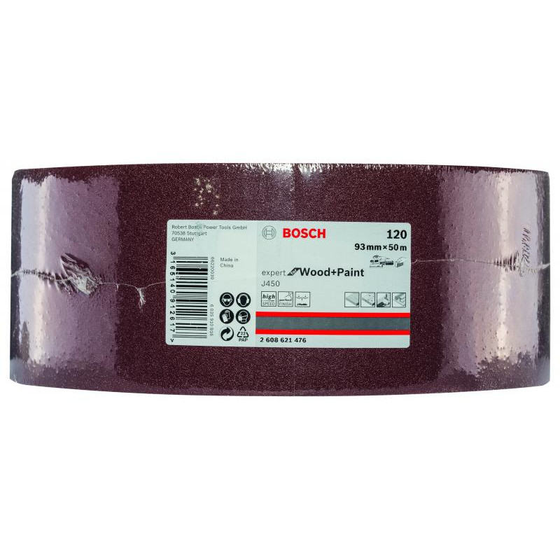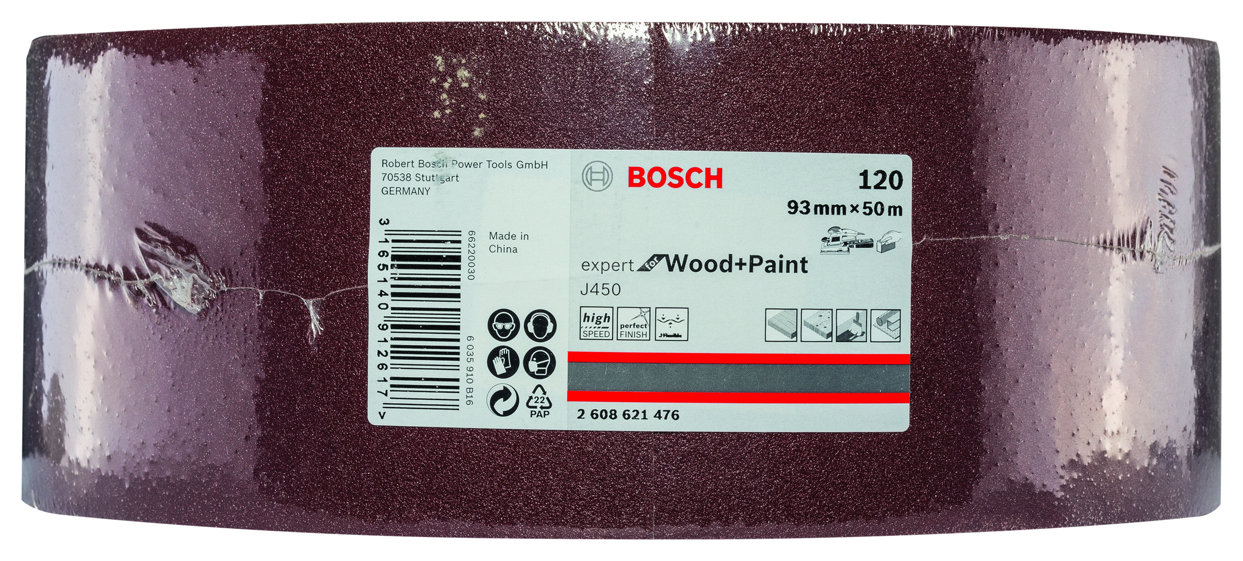 Emballage: 1 Marque: Bosch Référence: 2608621476 EAN: 3165140912617 Description: Rouleau abrasif J450 Expert for Wood and Paint, 93 mm x 50 m, grain 120