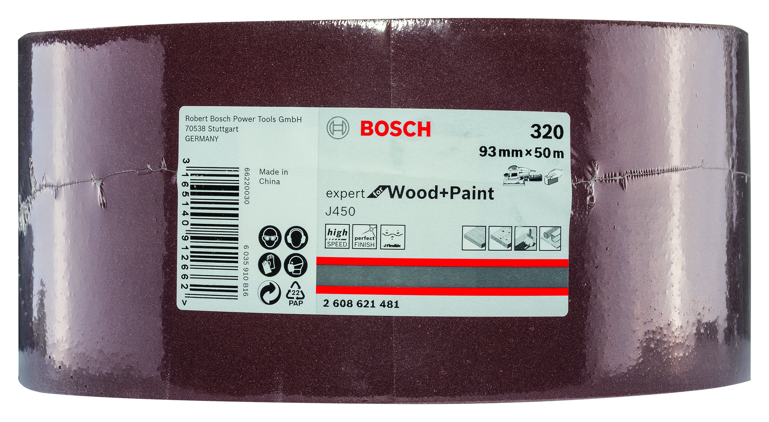 Emballage: 1 Marque: Bosch Référence: 2608621481 EAN: 3165140912662 Description: Rouleau abrasif J450 Expert for Wood and Paint, 93 mm x 50 m, grain 320