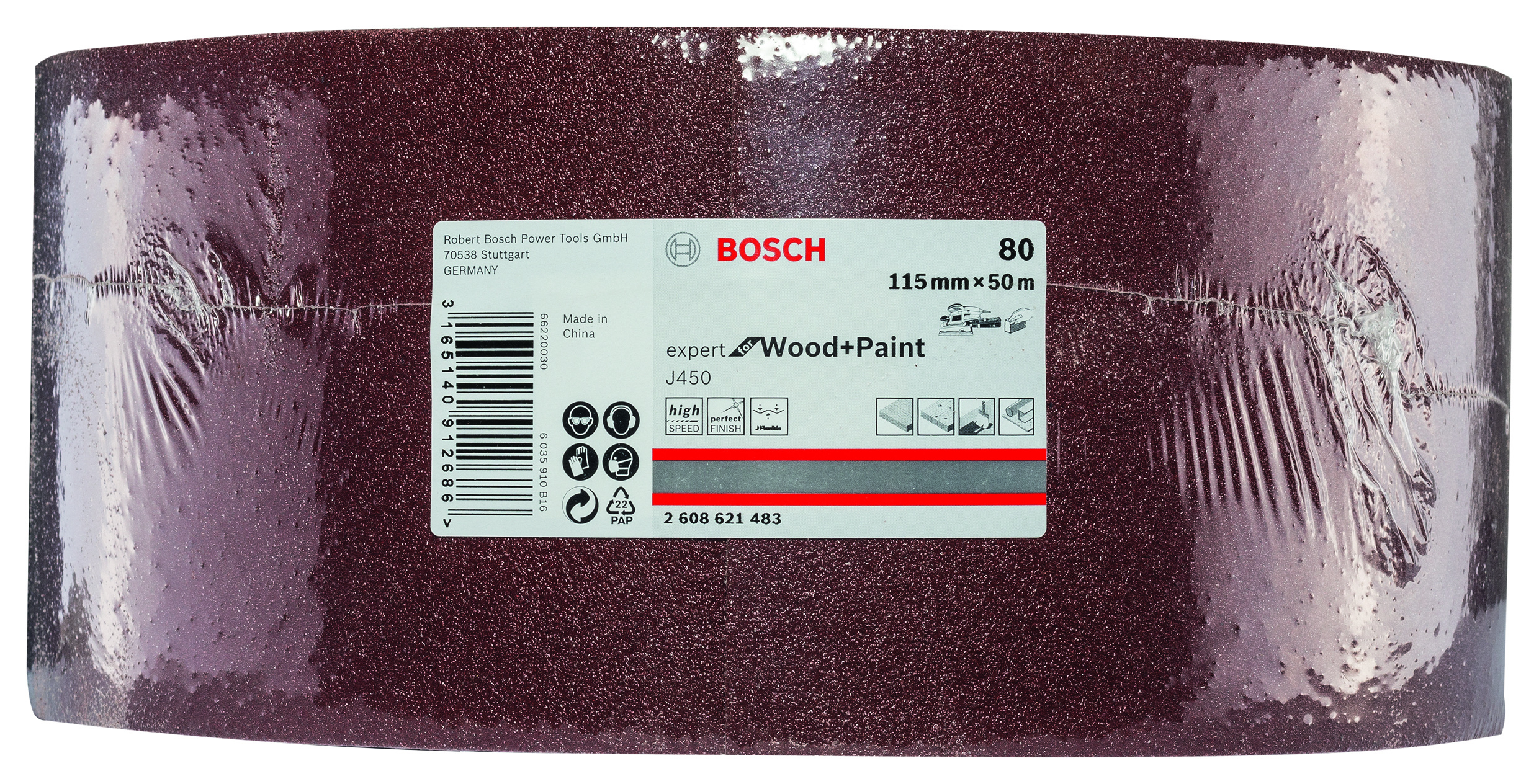 Emballage: 1 Marque: Bosch Référence: 2608621483 EAN: 3165140912686 Description: Rouleau abrasif J450 Expert for Wood and Paint, 115 mm x 50 m, grain 80