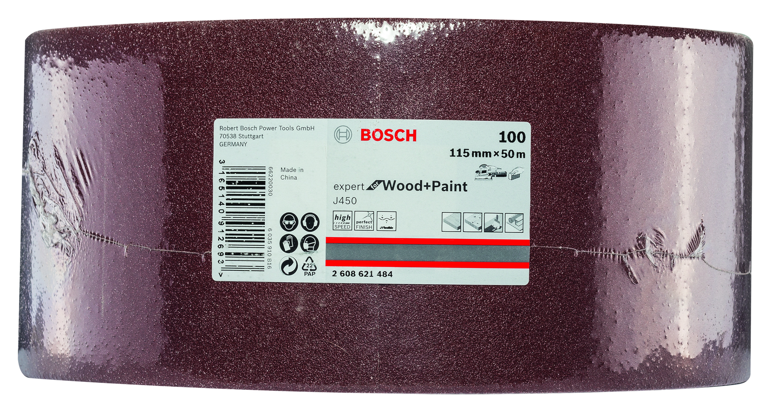 Emballage: 1 Marque: Bosch Référence: 2608621484 EAN: 3165140912693 Description: Rouleau abrasif J450 Expert for Wood and Paint, 115 mm x 50 m, grain 100