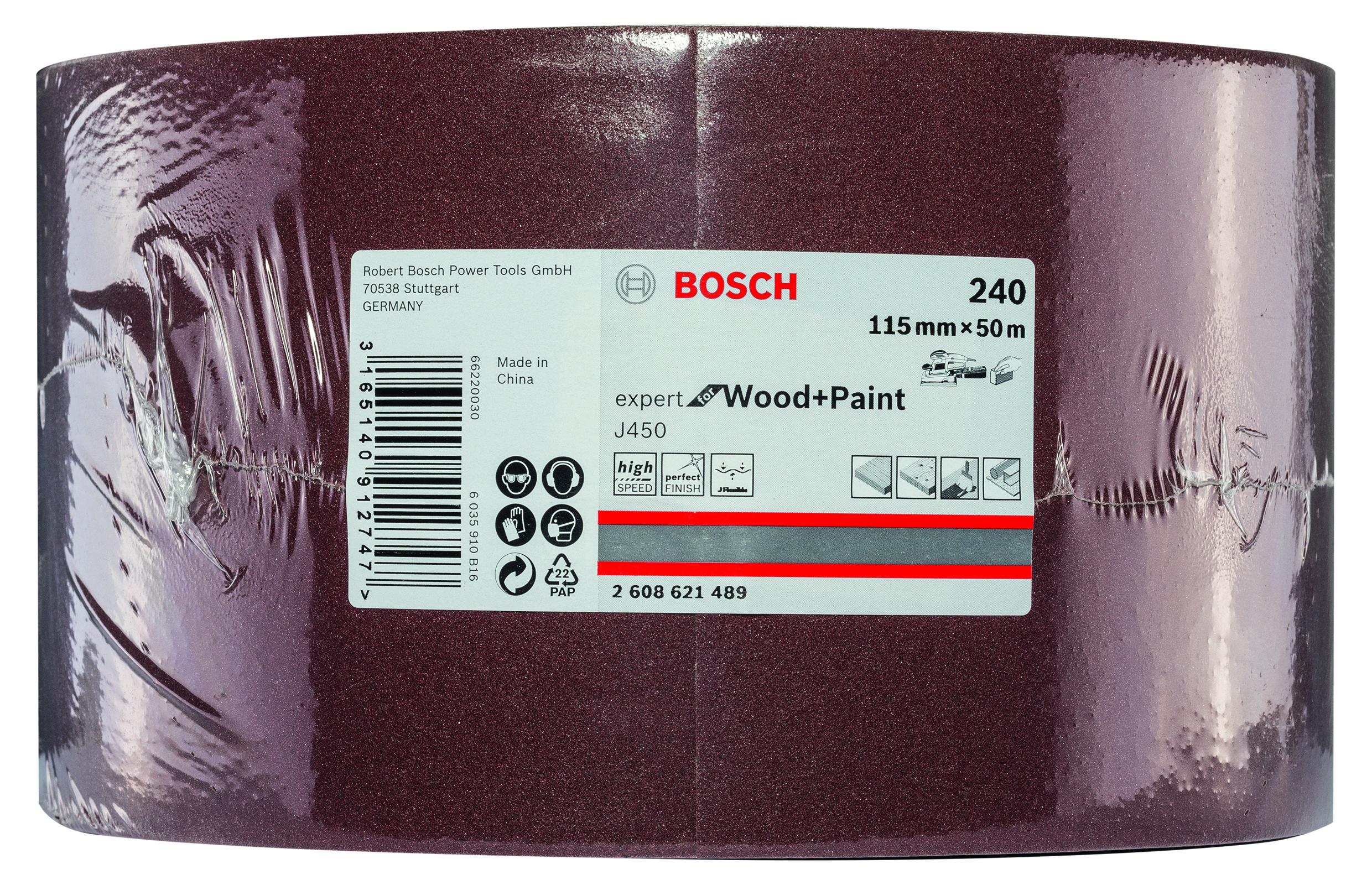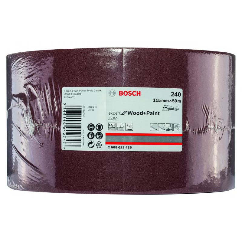 Emballage: 1 Marque: Bosch Référence: 2608621489 EAN: 3165140912747 Description: Rouleau abrasif J450 Expert for Wood and Paint, 115 mm x 50 m, grain 240