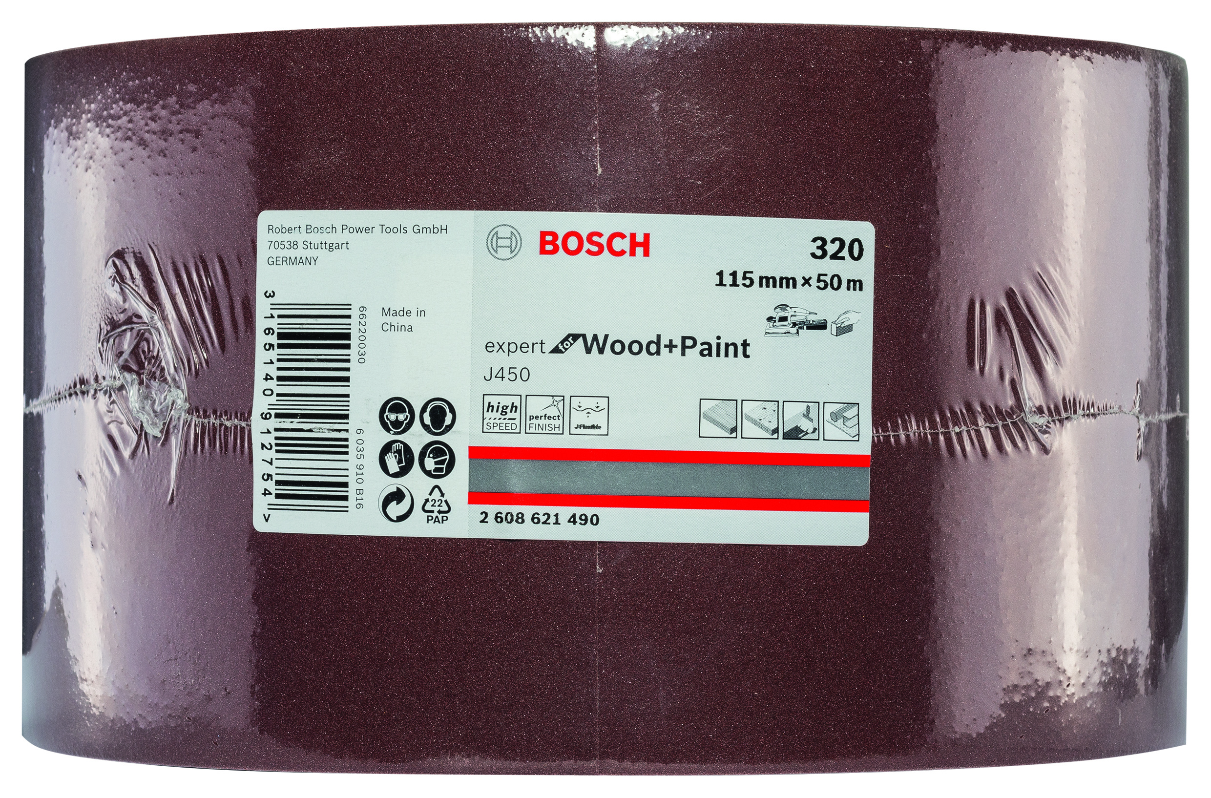 Emballage: 1 Marque: Bosch Référence: 2608621490 EAN: 3165140912754 Description: Rouleau abrasif J450 Expert for Wood and Paint, 115 mm x 50 m, grain 320