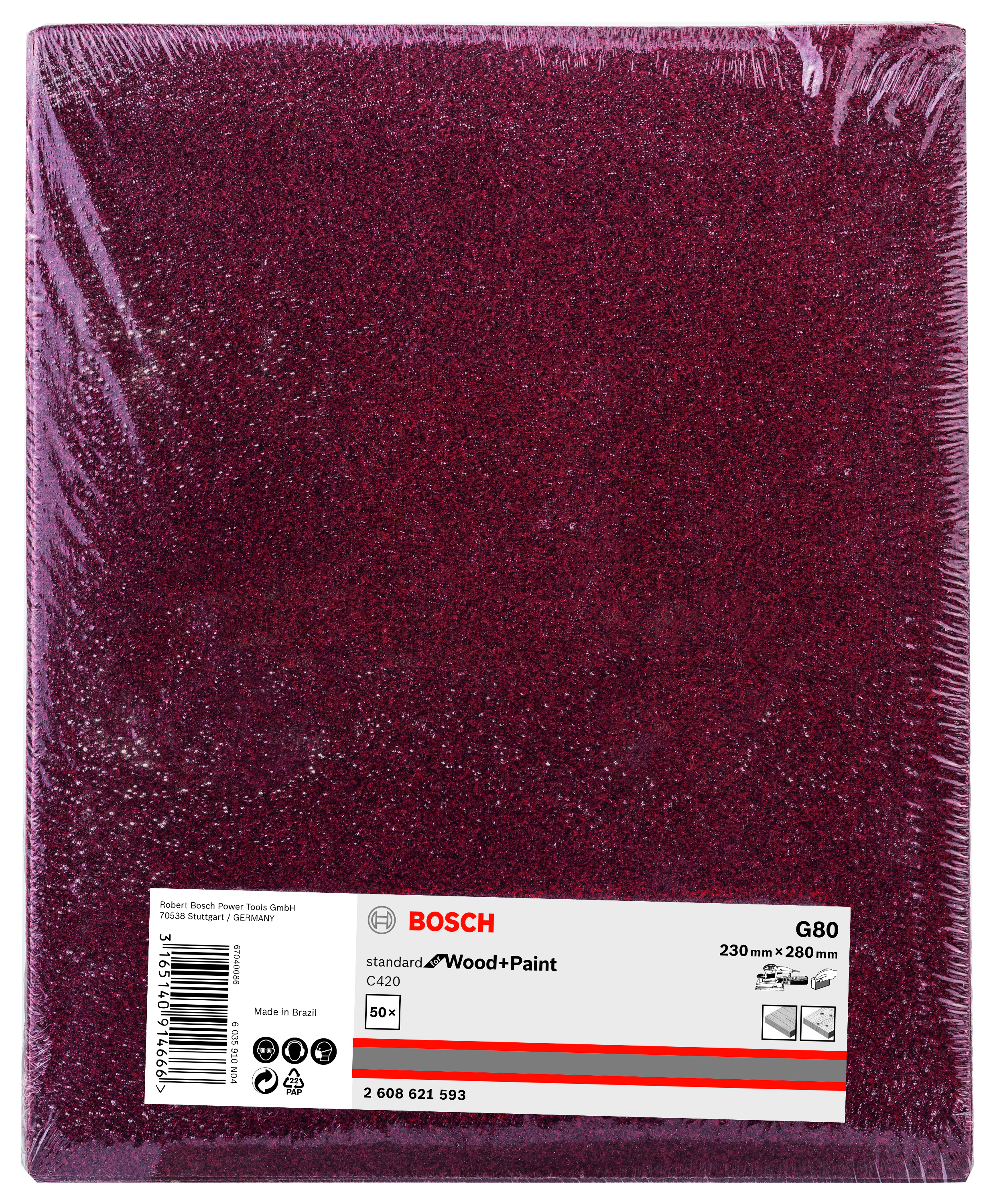 Emballage: 1Marque: BoschRéférence: 2608621593EAN: 3165140914666Description: Abrasif C420 Standard for Wood and Paint, 230 x 280 mm, grain 80
