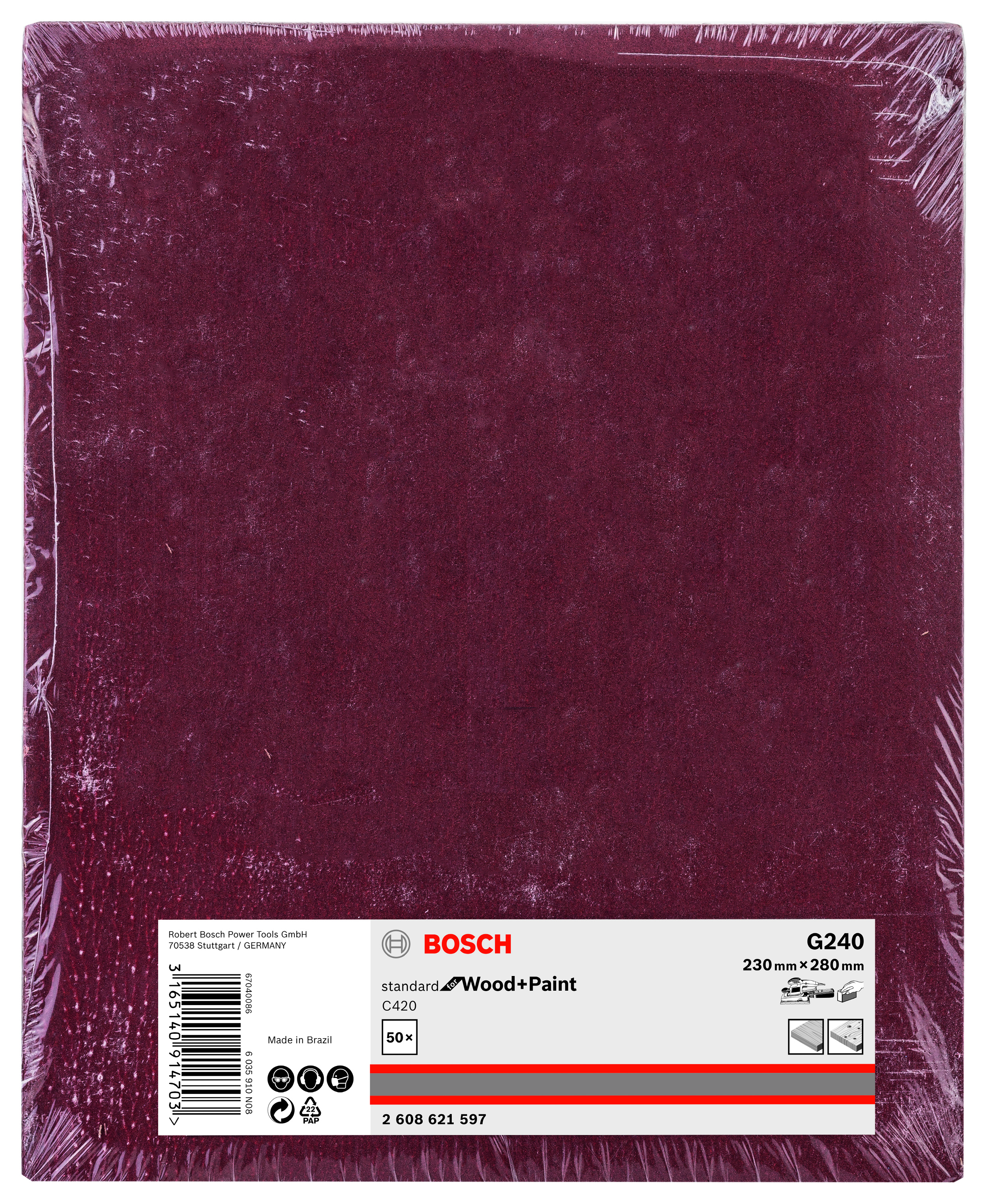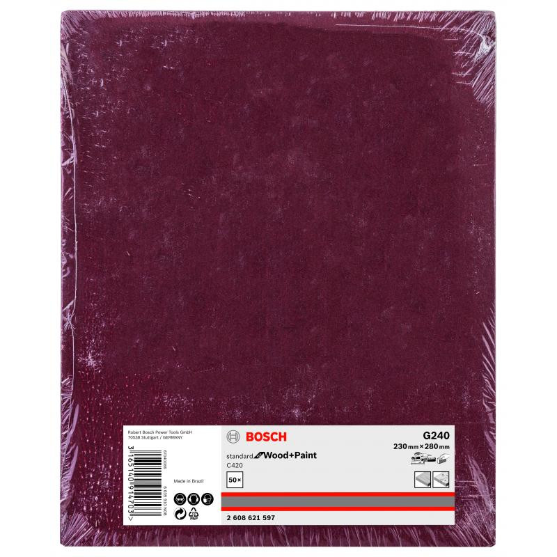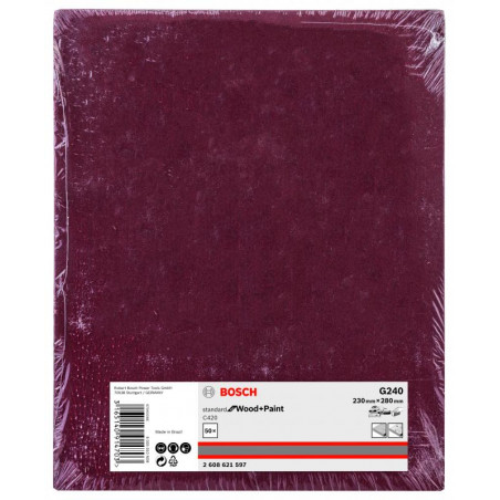 Emballage: 1Marque: BoschRéférence: 2608621597EAN: 3165140914703Description: Abrasif C420 Standard for Wood and Paint, 230 x 280 mm, grain 240