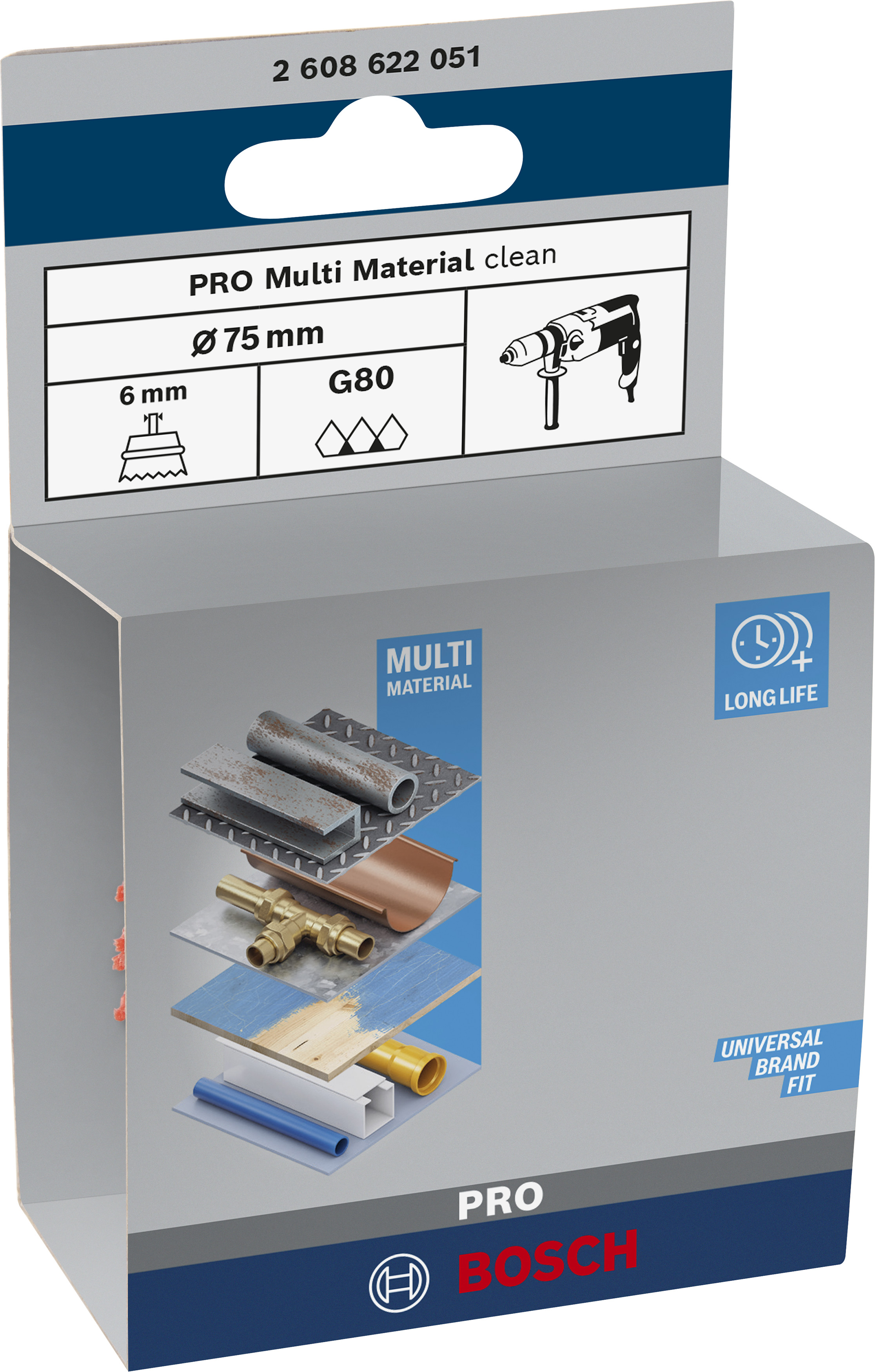 Emballage: 1Marque: BoschRéférence: 2608622051EAN: 3165140082105Description: Brosse boisseau PRO Multi-matériaux pour perceuse 75x1 mm
