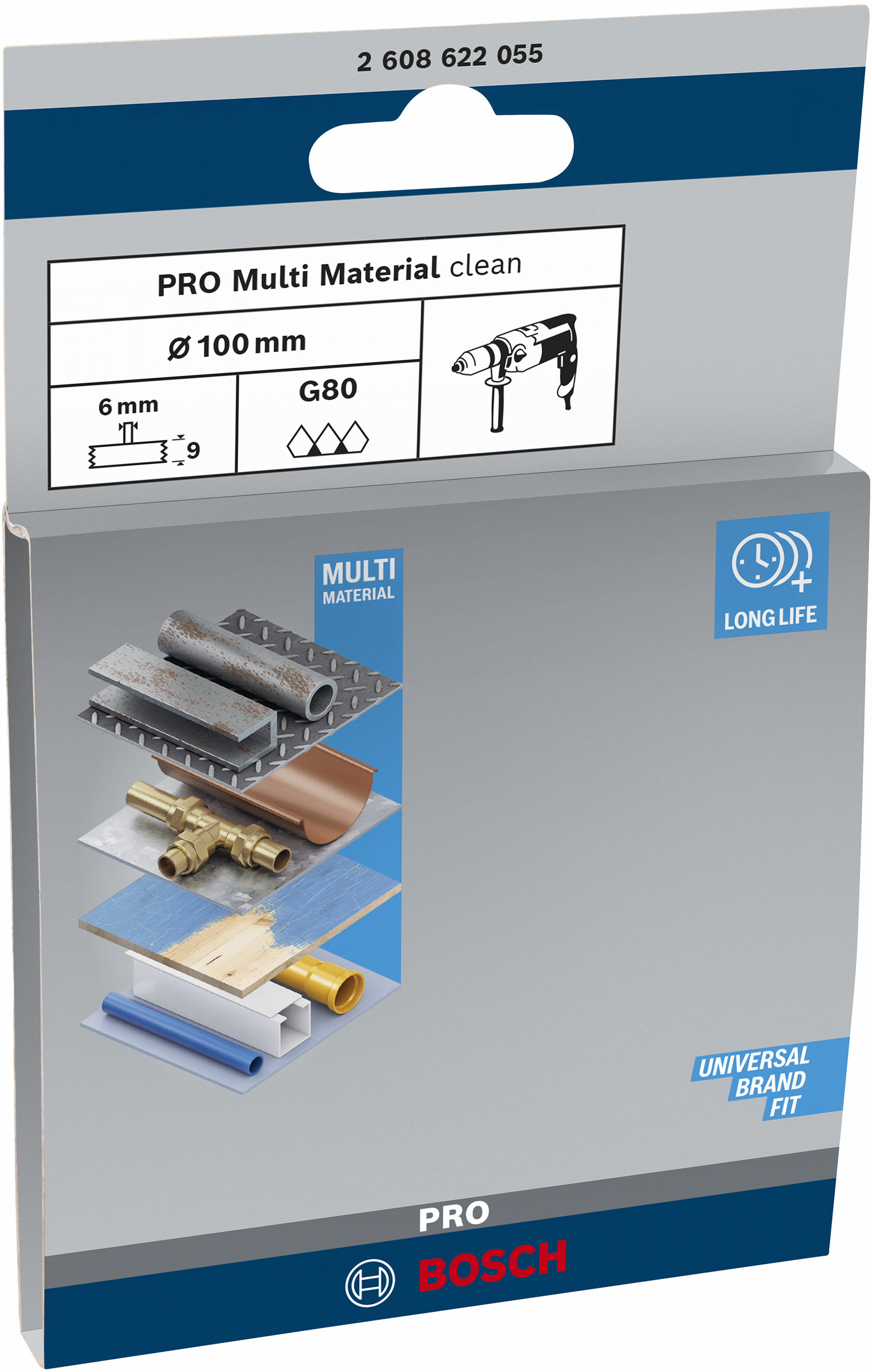 Emballage: 1Marque: BoschRéférence: 2608622055EAN: 3165140082143Description: Brosse circulaire PRO Multi-matériaux pour perceuse 100x1 mm