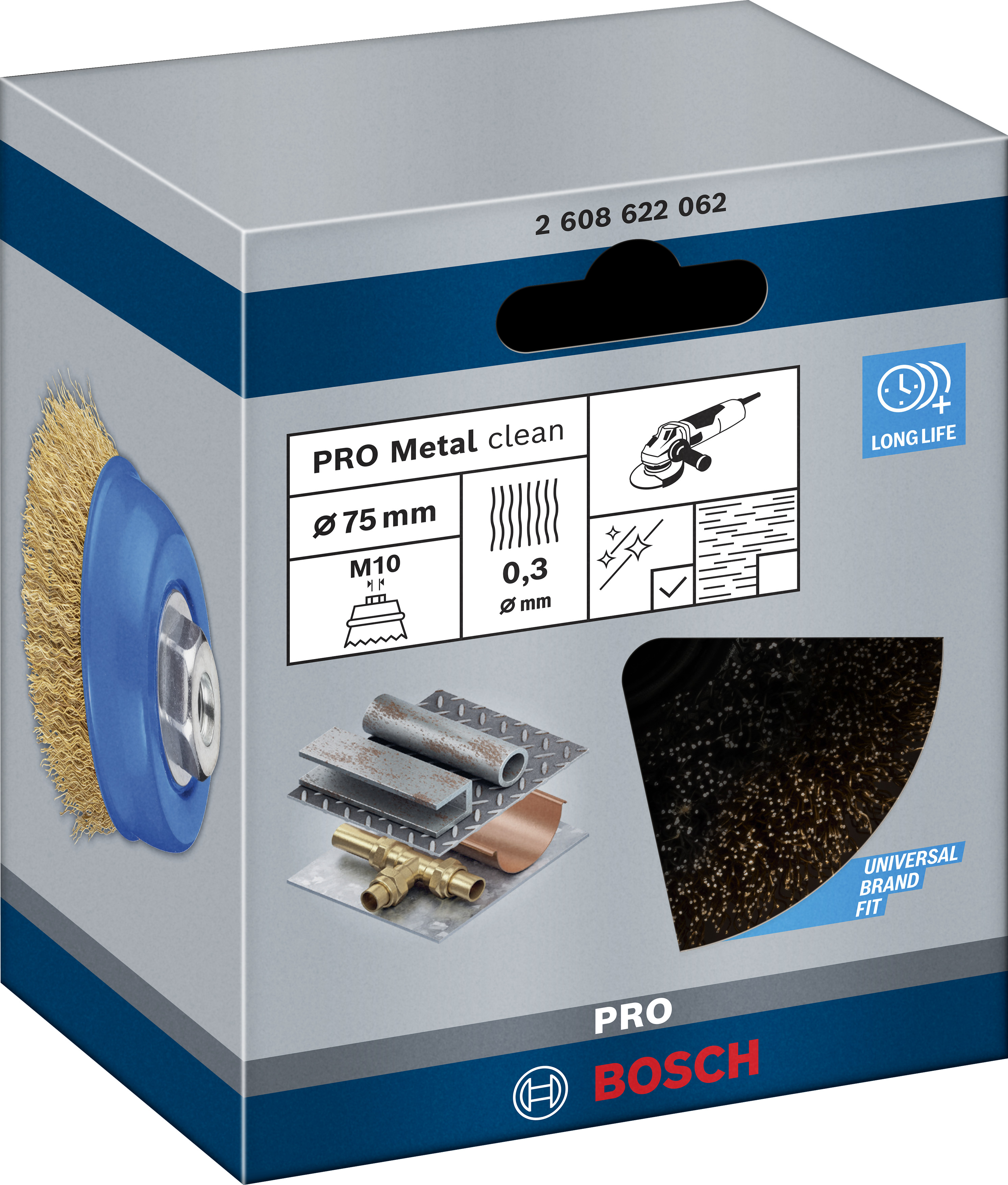 Emballage: 1Marque: BoschRéférence: 2608622062EAN: 3165140102704Description: Brosse boisseau PRO Multi-matériaux M14 75x0.3 mm