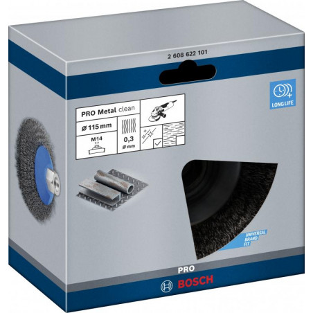 Emballage: 1Marque: BoschRéférence: 2608622101EAN: 3165140631815Description: Brosse biseau PRO pour le Métal M14 115x0.3 mm