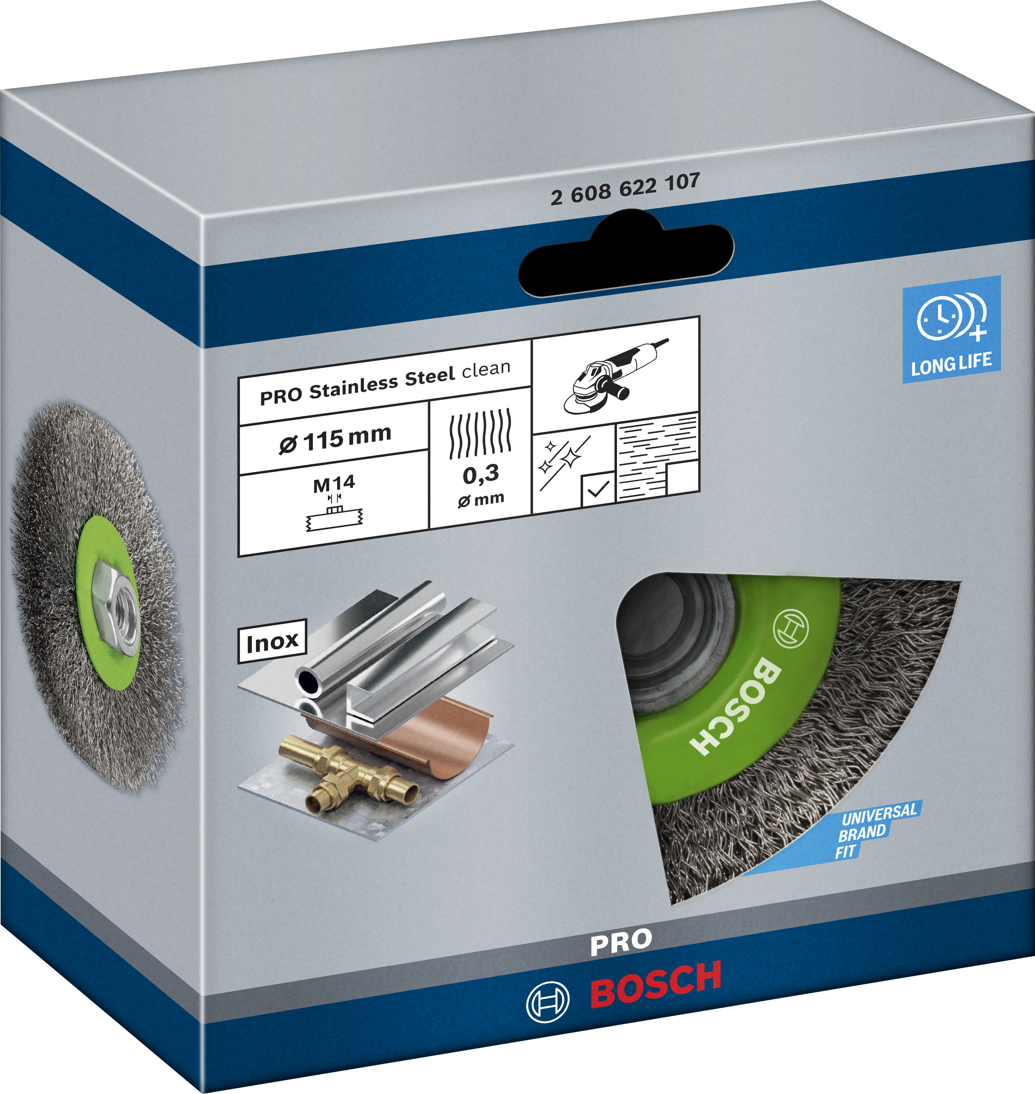 Emballage: 1Marque: BoschRéférence: 2608622107EAN: 3165140631877Description: Brosse circulaire PRO pour l'Inox M14 25x0.3 mm
