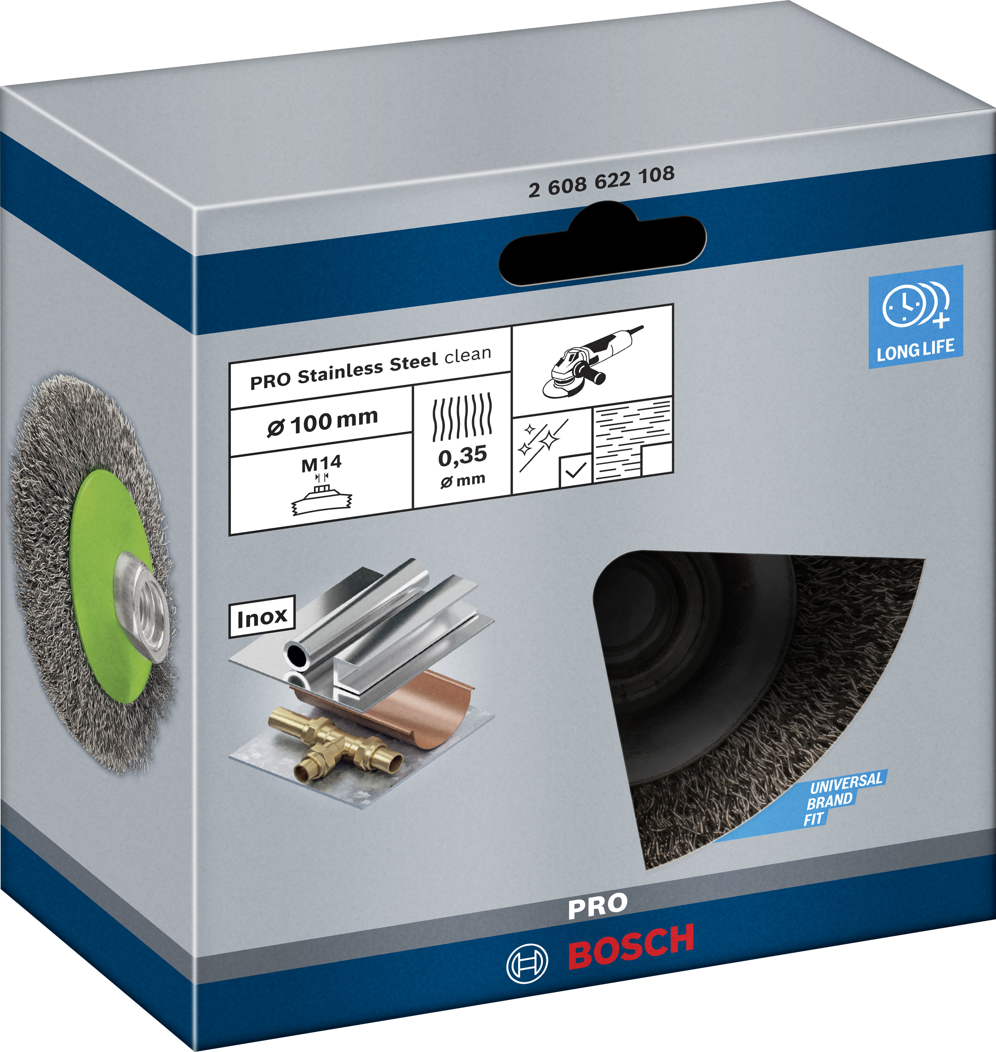 Emballage: 1Marque: BoschRéférence: 2608622108EAN: 3165140631884Description: Brosse en biseau PRO pour l'Inox M14 100x0.35 mm