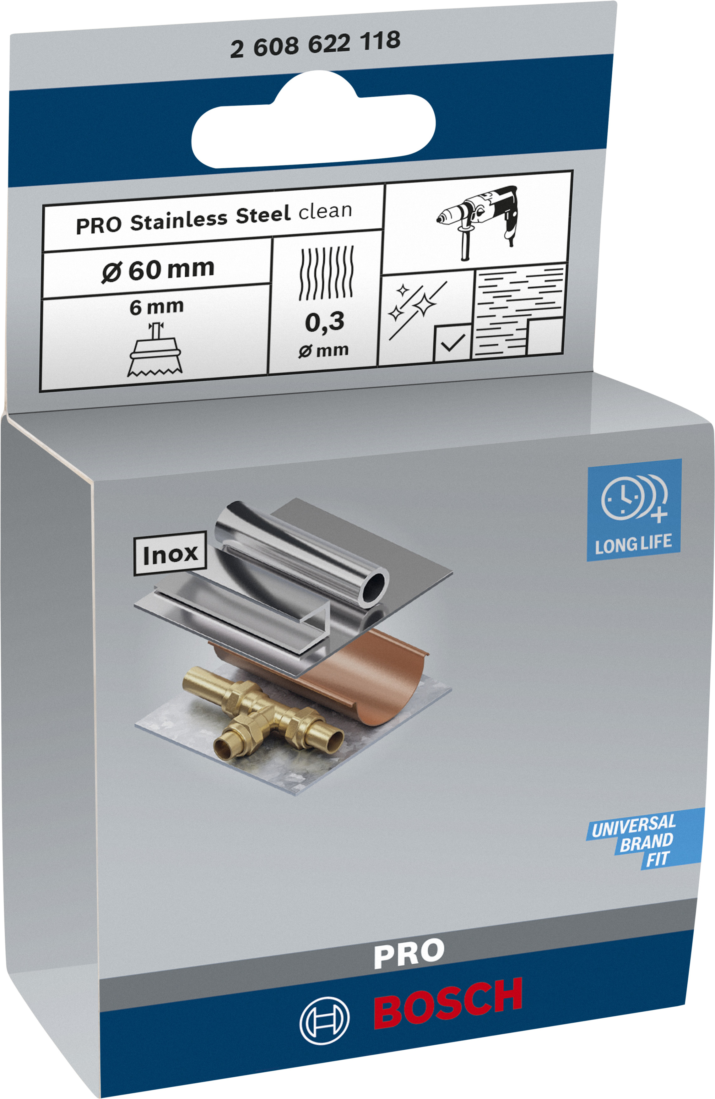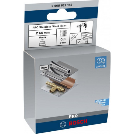 Emballage: 1Marque: BoschRéférence: 2608622118EAN: 3165140631983Description: Brosse en biseau PRO pour l'Inox pour perceuse 60x0.3 mm