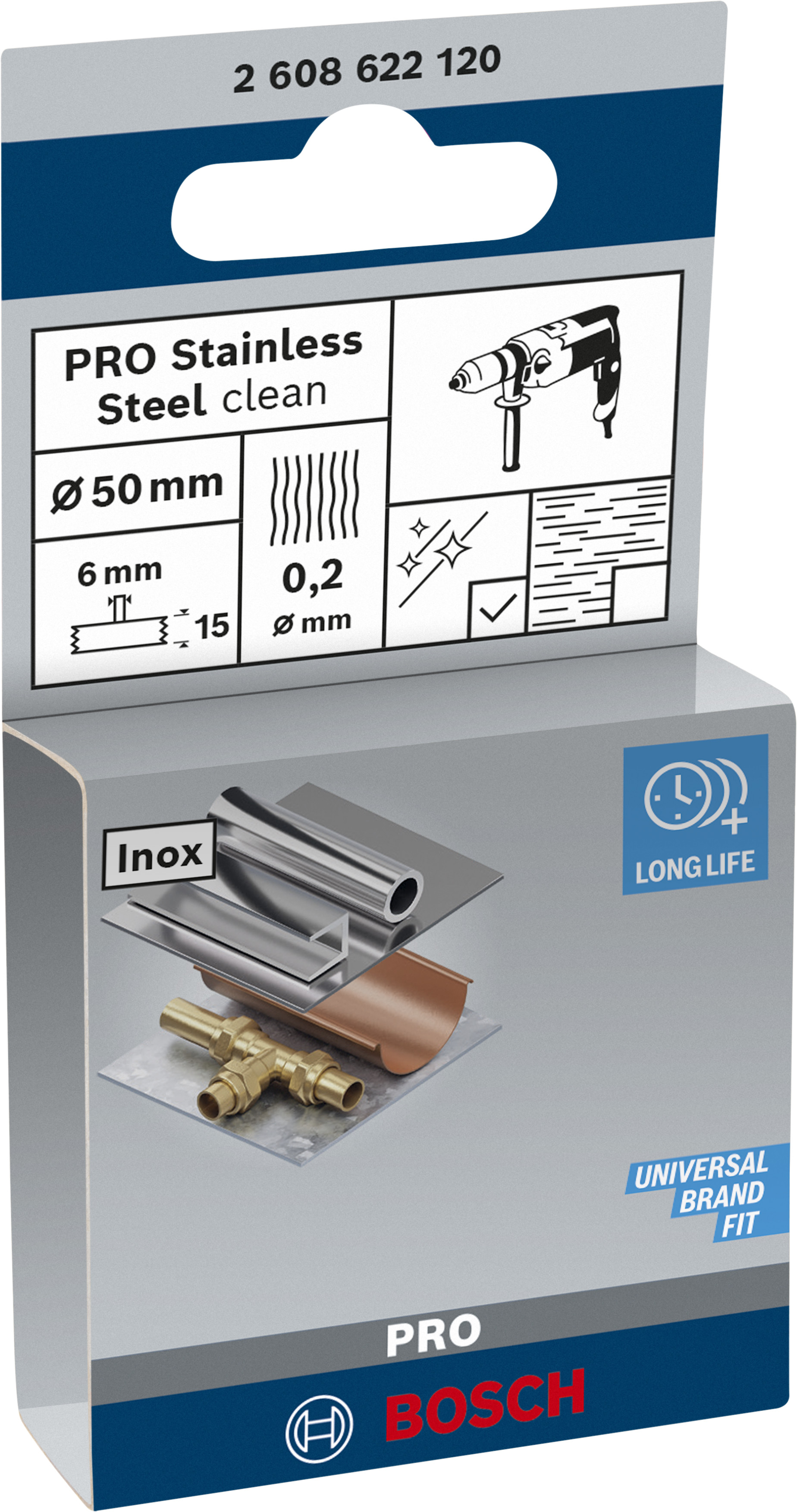 Emballage: 1Marque: BoschRéférence: 2608622120EAN: 3165140632003Description: Brosse circulaire PRO pour l'Inox pour perceuse 50x0.2 mm